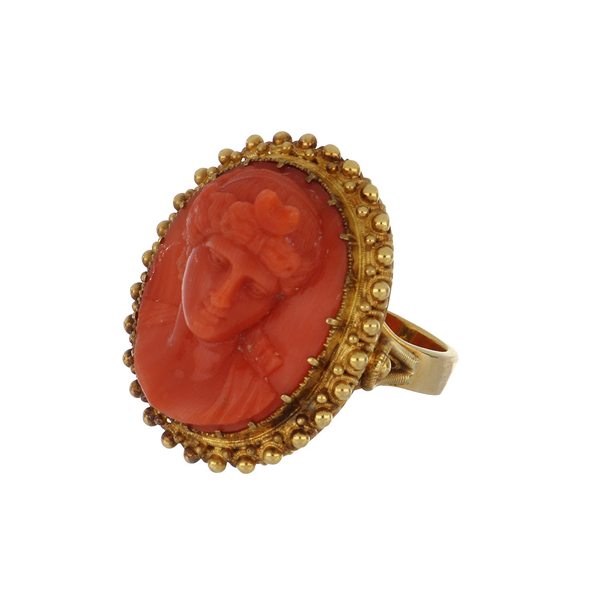 Victorian 18K Gold Etruscan Revival Cameo Coral Ring