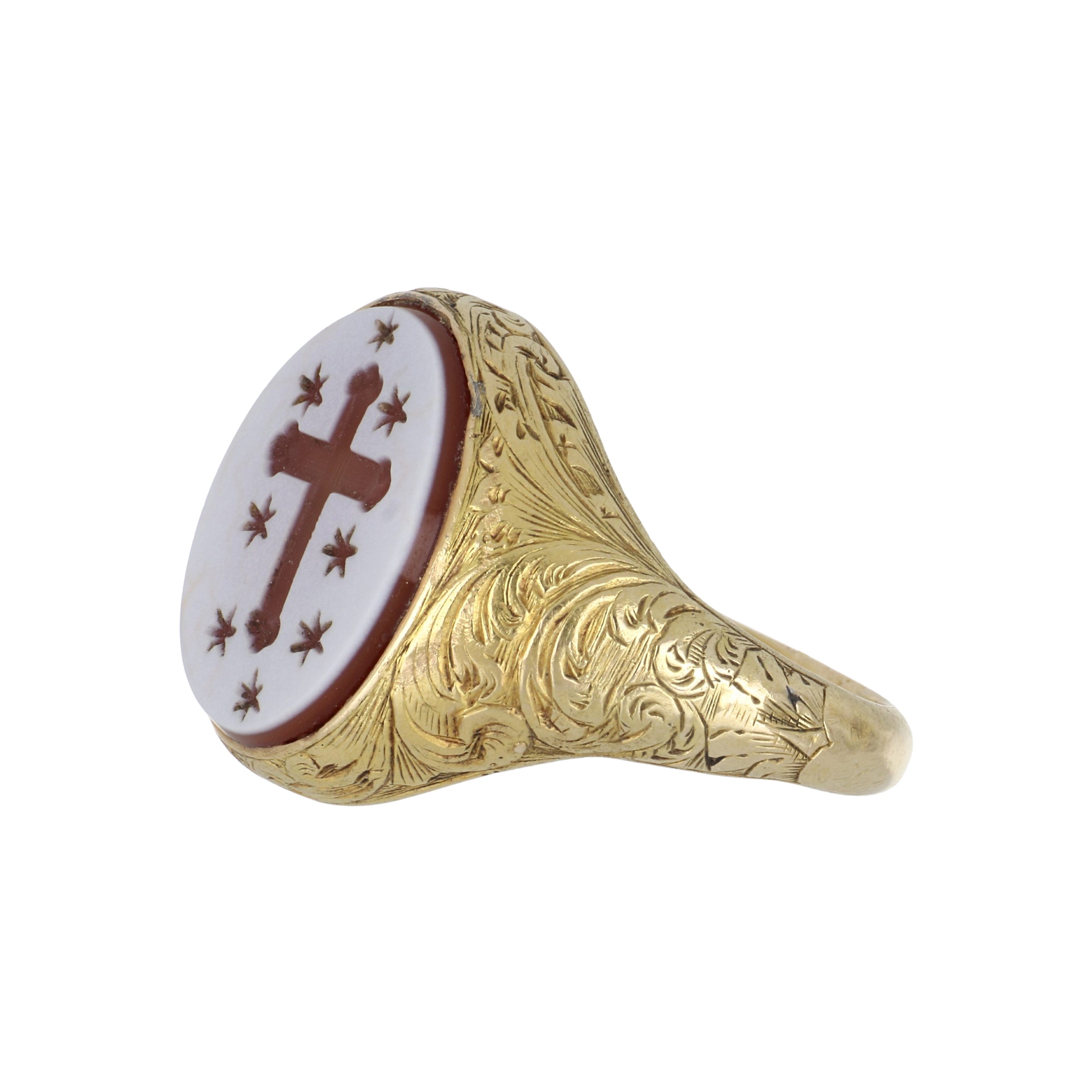 A Victorian cross intaglio ring with chasing, set in 18K yellow gold. Circa 1860.