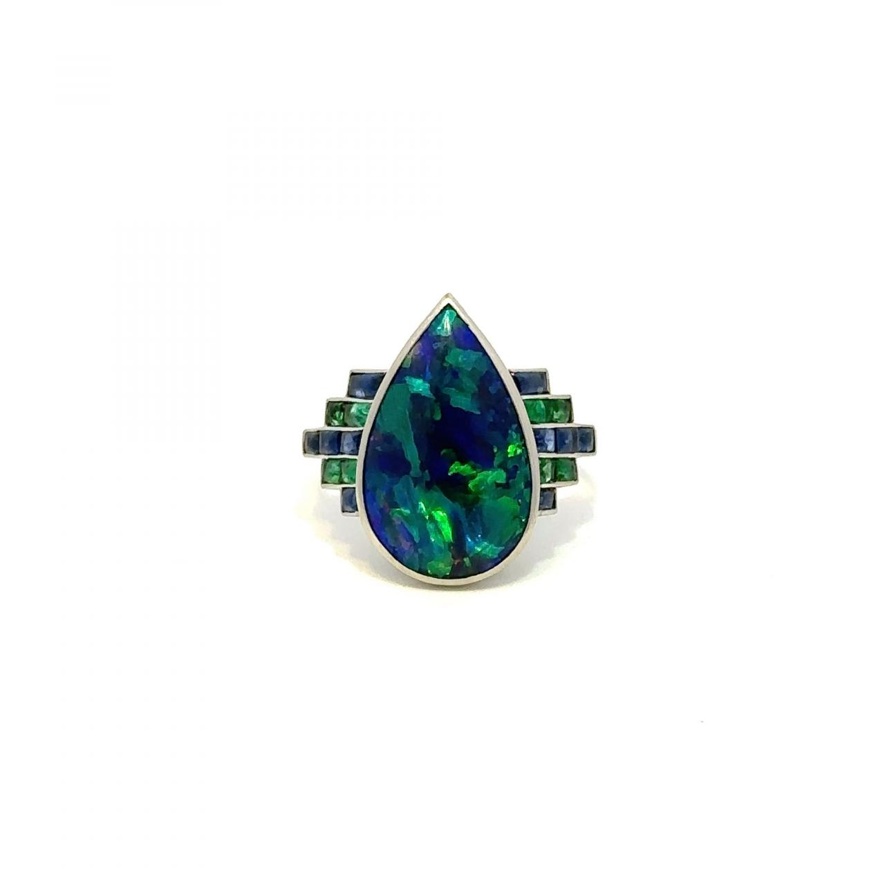 An estate antique, Art-Deco black opal ring with buff-top calibre-cut emerald & sapphire shoulders, set in platinum.
