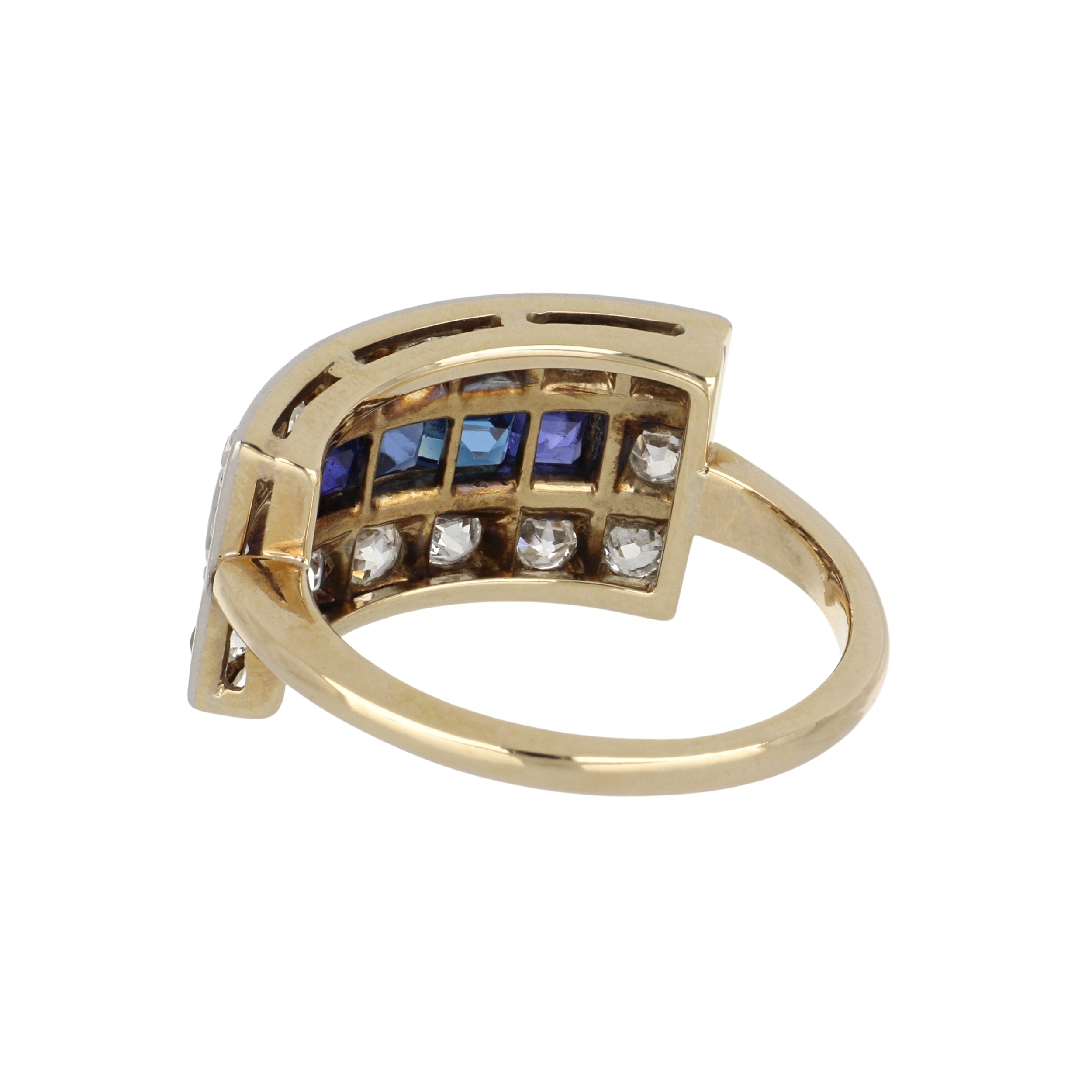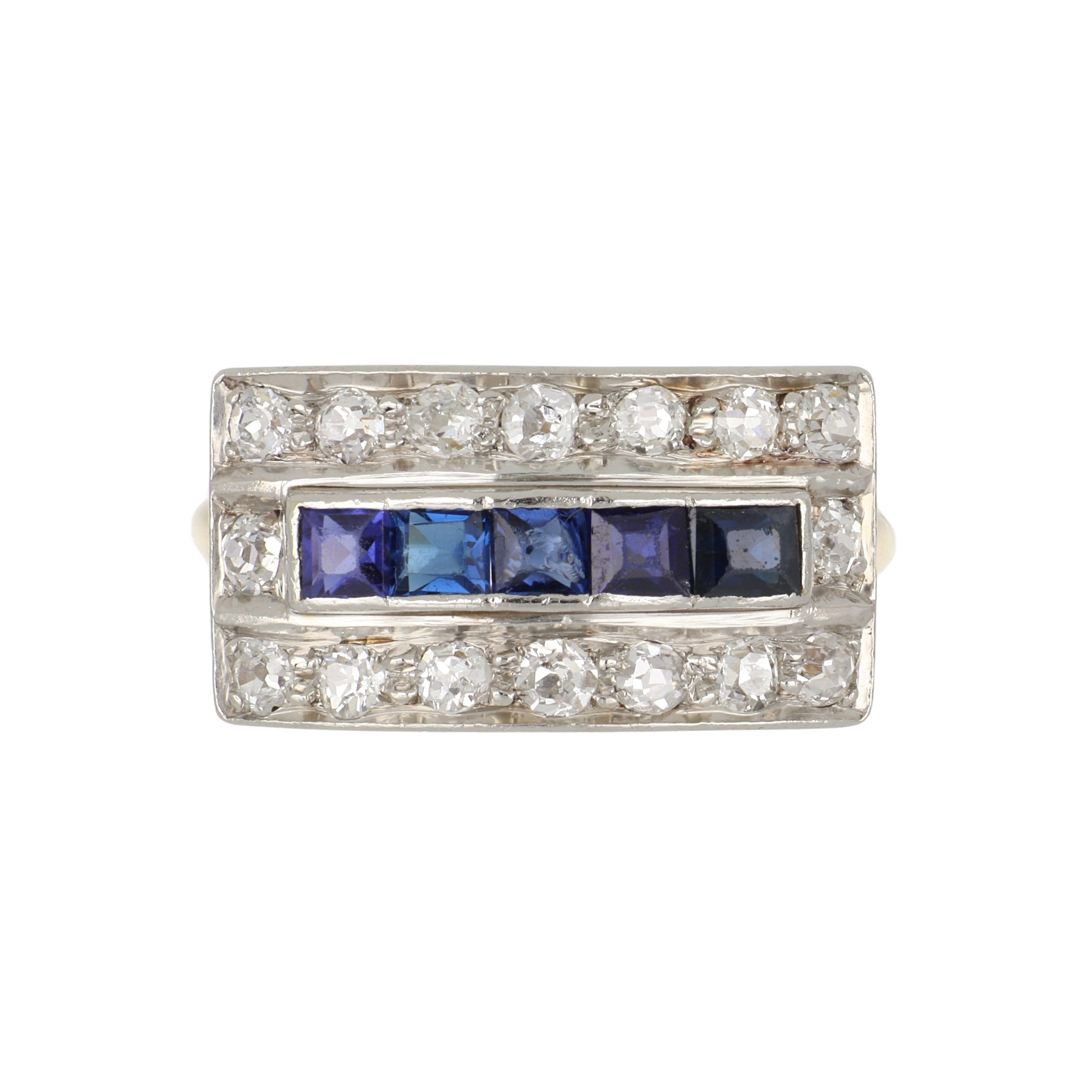 An Art Deco diamond bar ring with synthetic sapphires, set in platinum and 14k yellow gold. Circa 1920.