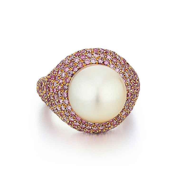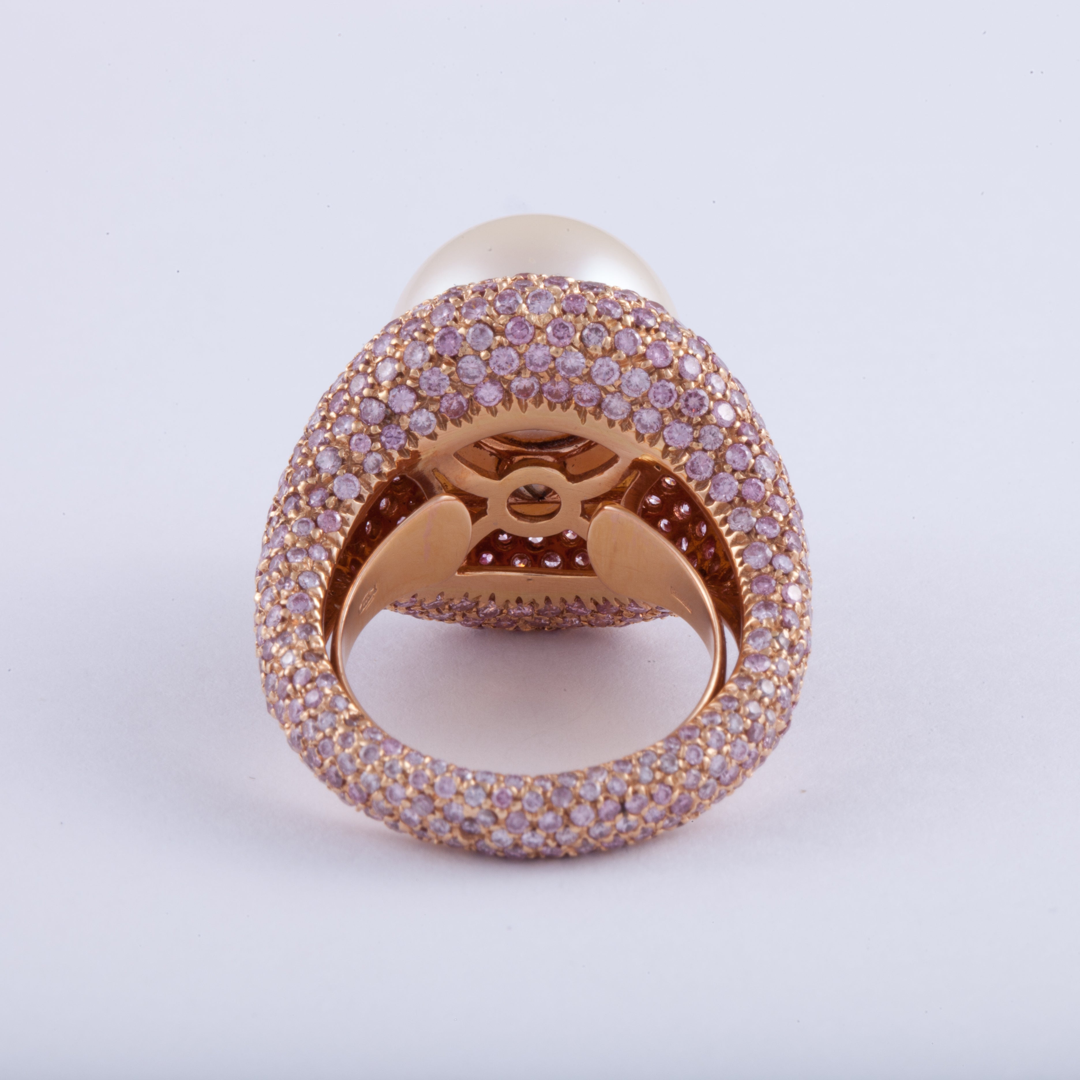 An estate South Sea pearl ring with pave-set round brilliant-cut, fancy pink diamond accents, set in 18k rose gold. Italian, circa 2000.