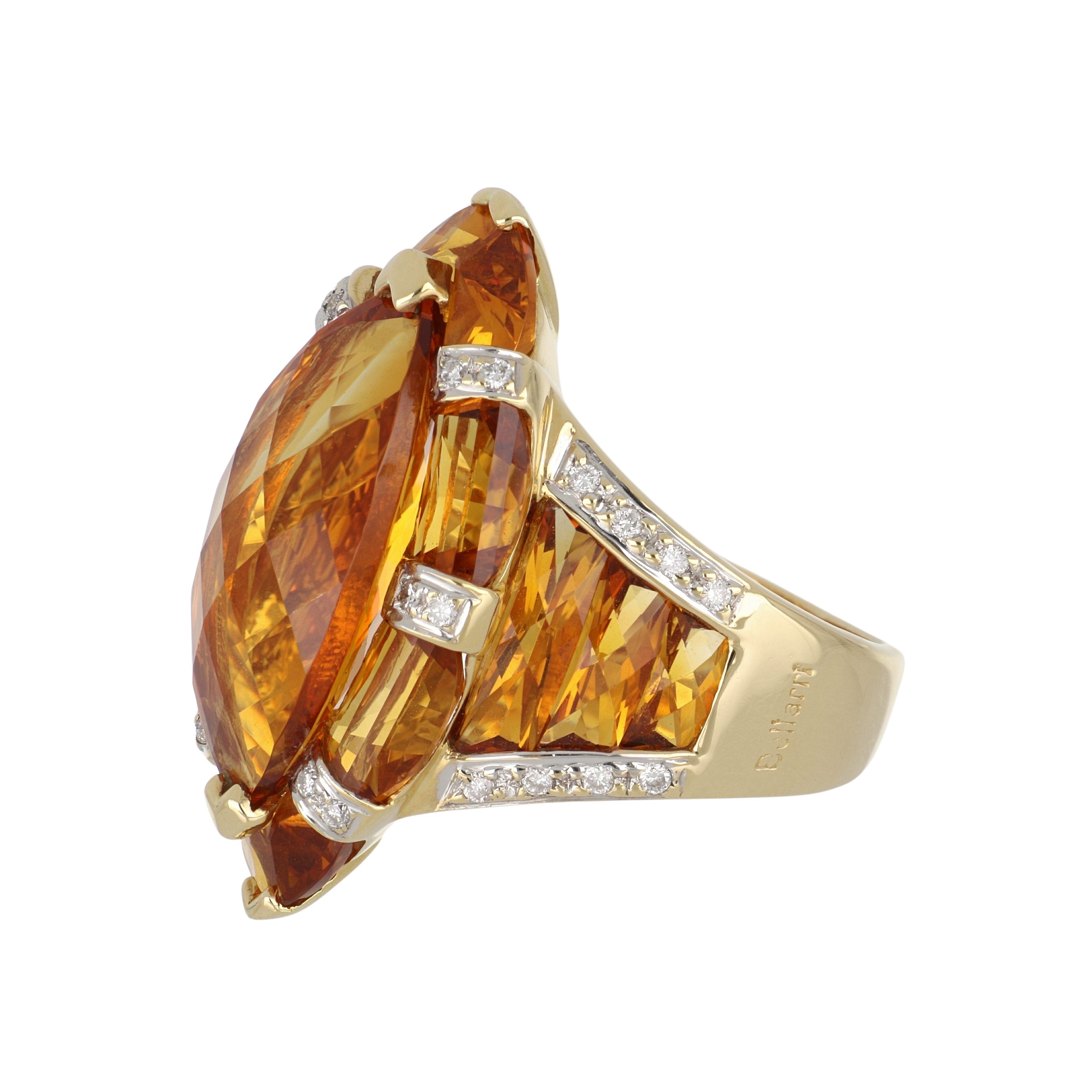 An estate Bellari marquise-cut citrine ring with calibre-cut citrine sides and diamond accents, set in 18K yellow gold. Circa 2000.