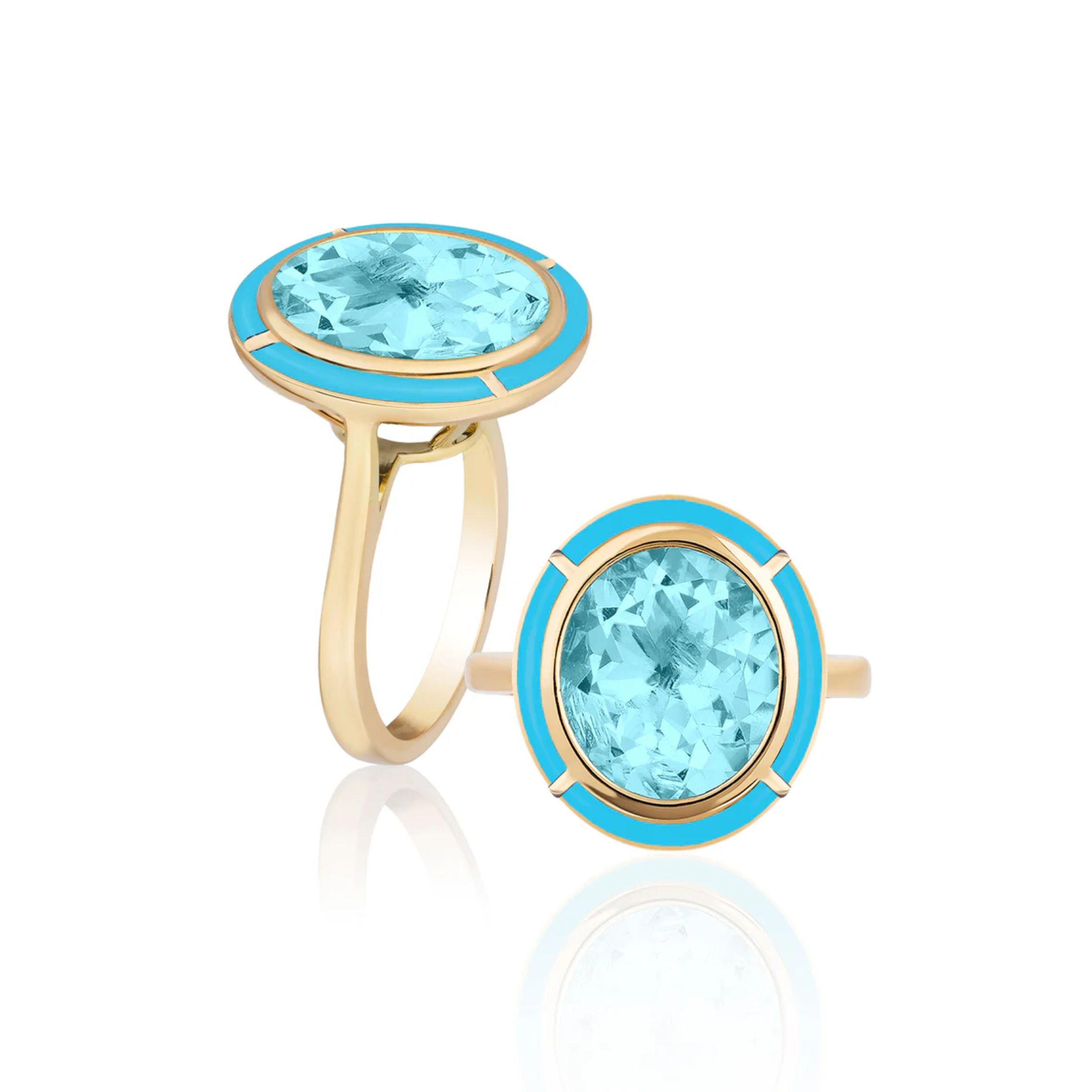 A Goshwara 'Melange' Collection ring featuring an oval blue topaz framed by inlaid turquoise in 18K yellow gold.