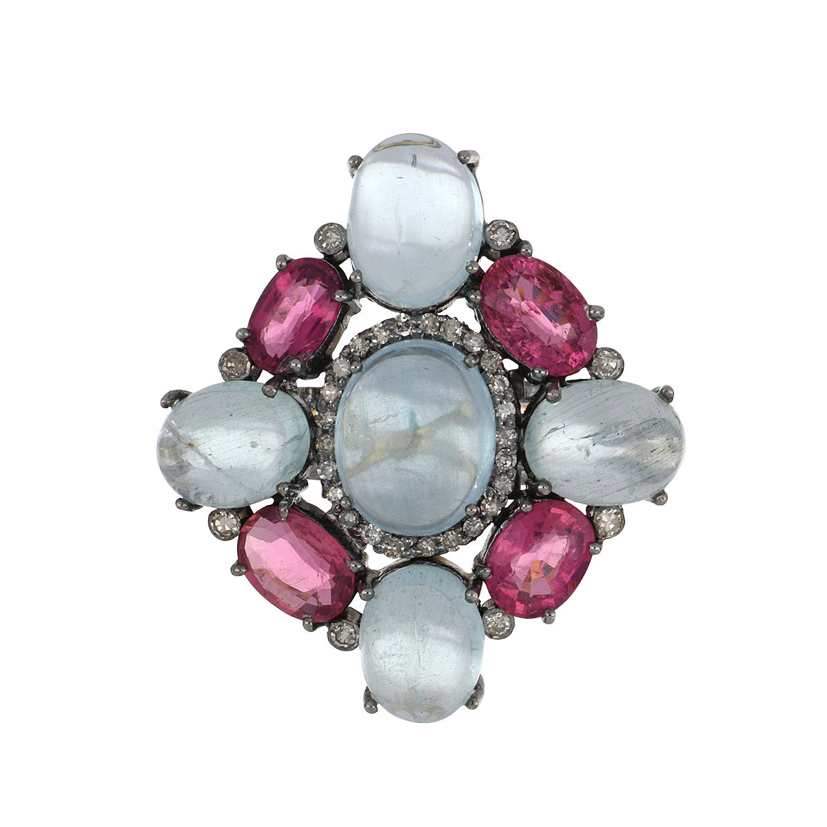 A Maharaja cluster cocktail ring featuring cabochon chatoyant aquamarine, oval-cut pink tourmaline and round diamonds, set in sterling silver and 14K yellow gold.