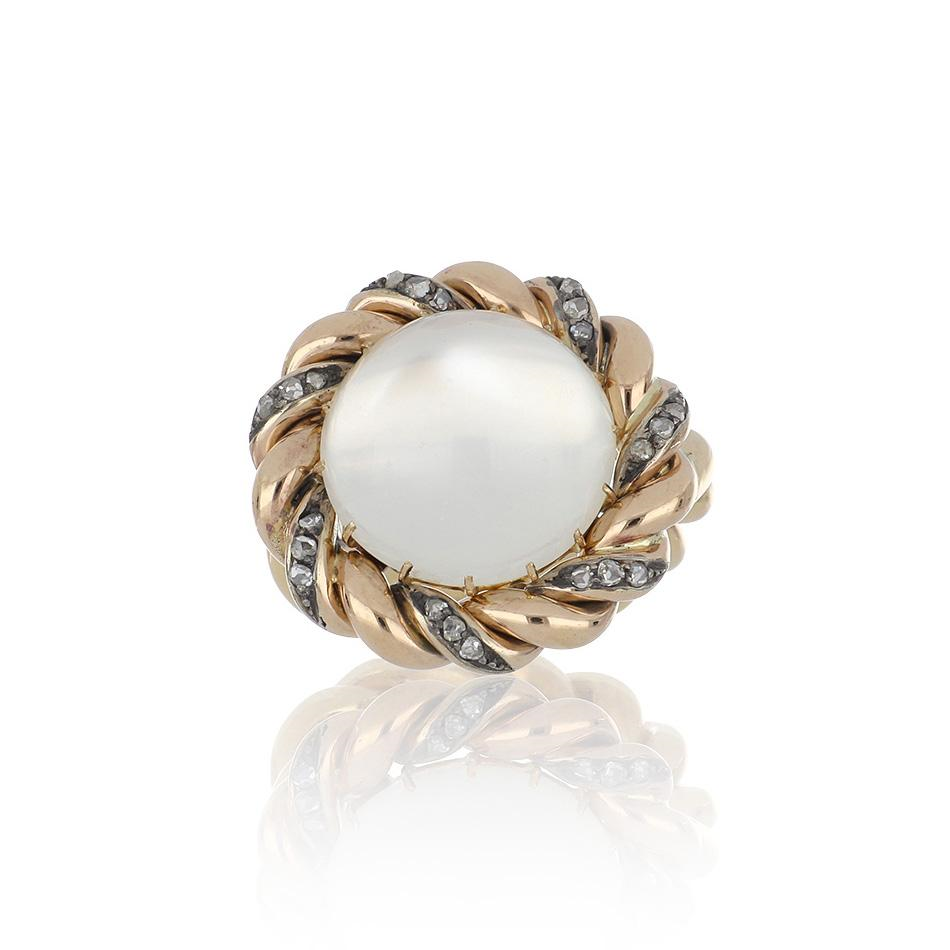 A Victorian cabochon moonstone ring with twisted shank and bezel frame accented with rose-cut diamonds, in 18K yellow gold and sterling silver. Circa 1880.