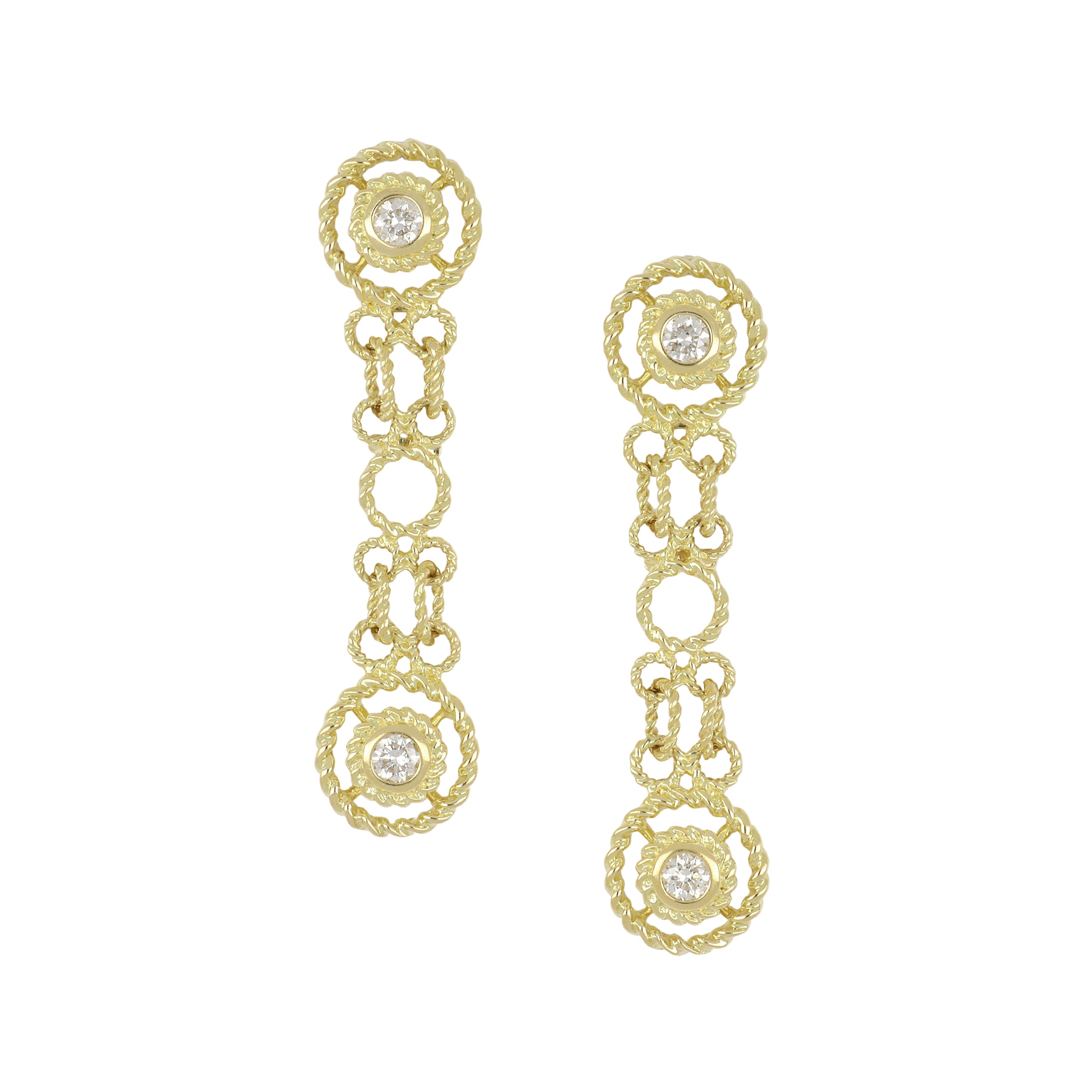 A pair of estate Roberto Coin fancy cable link drop earrings with bezel-set round brilliant-cut diamonds, in 18K yellow gold. With heart-shaped backs and Roberto Coin signature ruby accents.