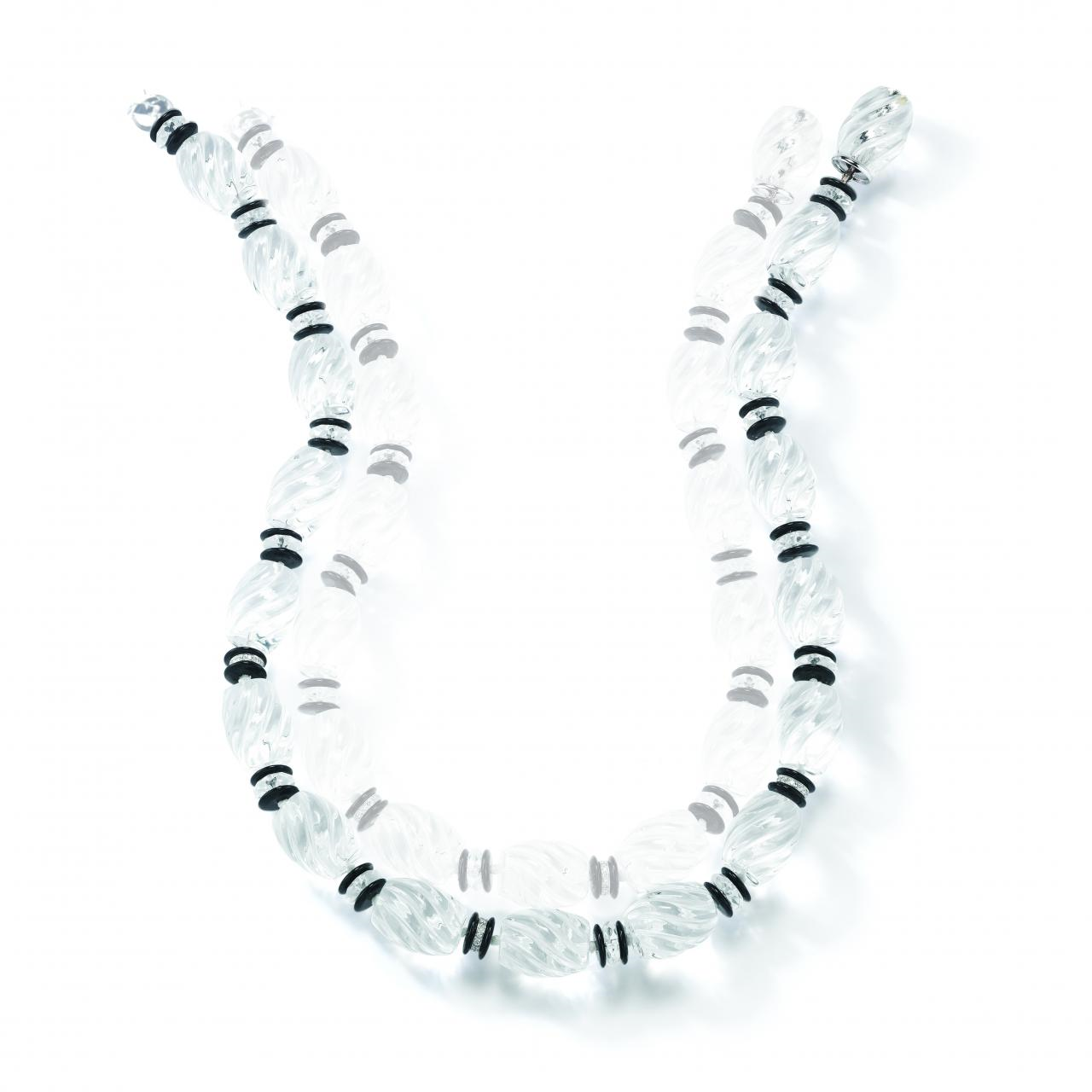 A Seaman Schepps oval fluted carved rock crystal bead torchon necklace with black onyx, and diamond rondelle accents, set in 18K white gold.