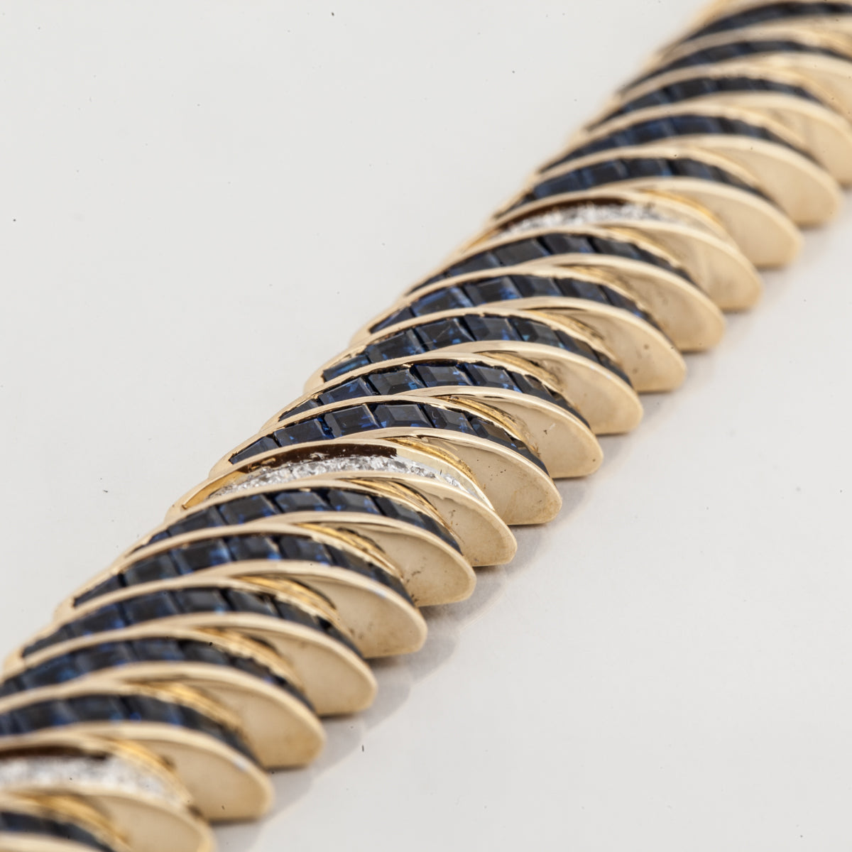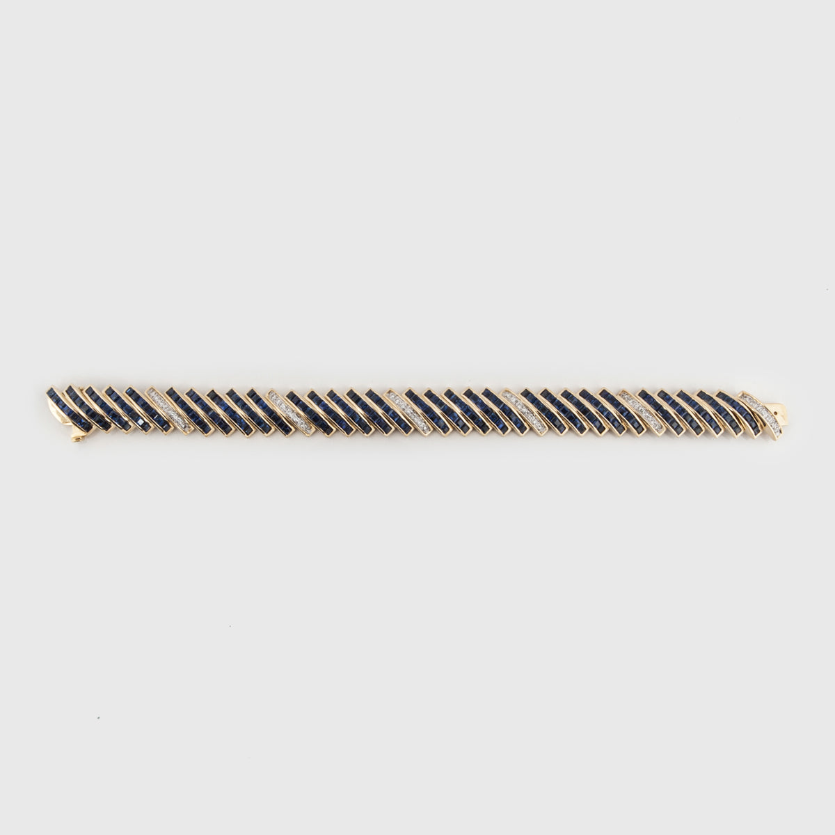 An estate channel-set curved bracelet with calibre-cut sapphire and round brilliant-cut diamonds, set in 18K yellow gold.