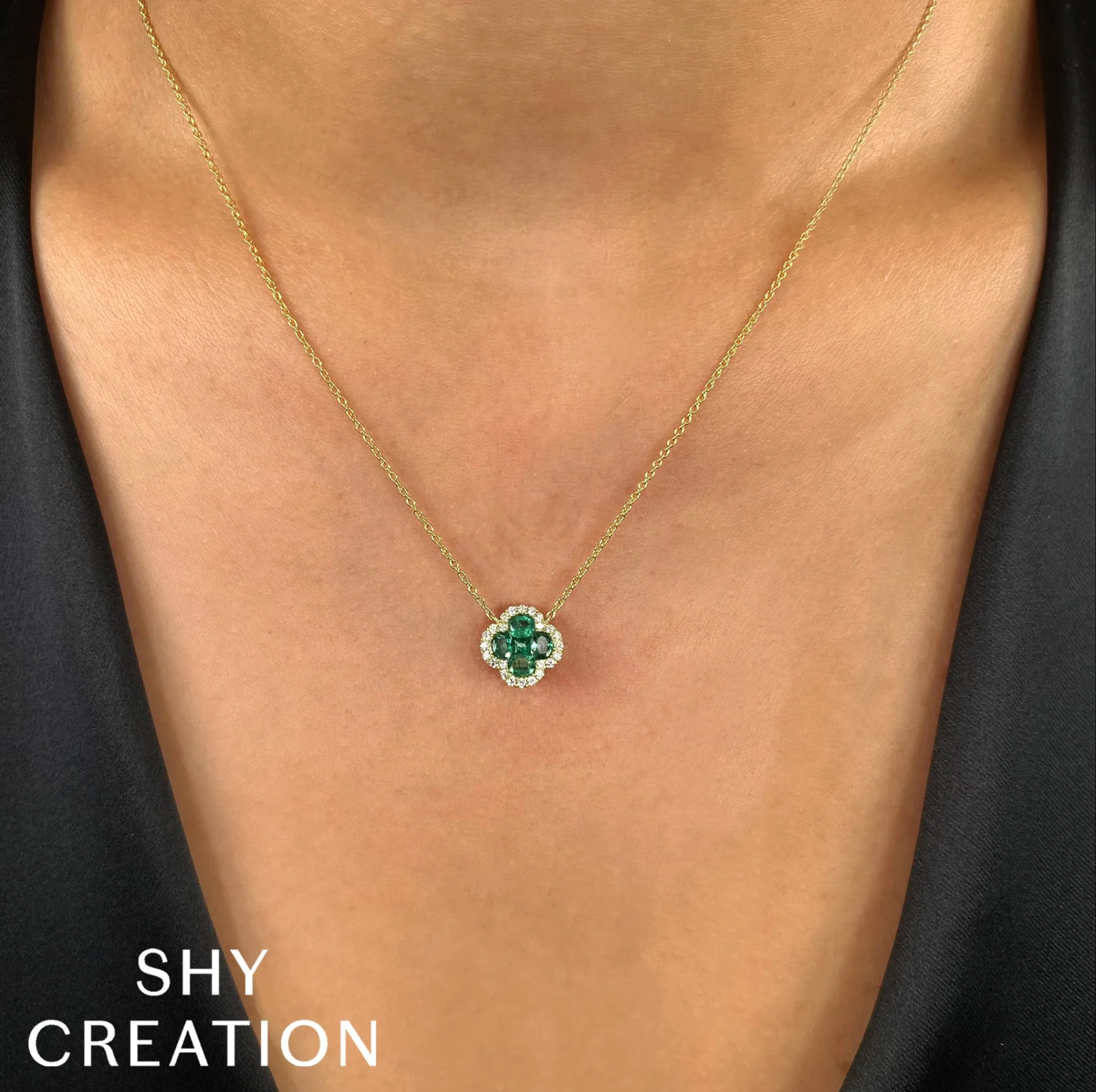 A Shy Creation emerald clover pendant necklace with a diamond halo, set in 14K yellow gold.