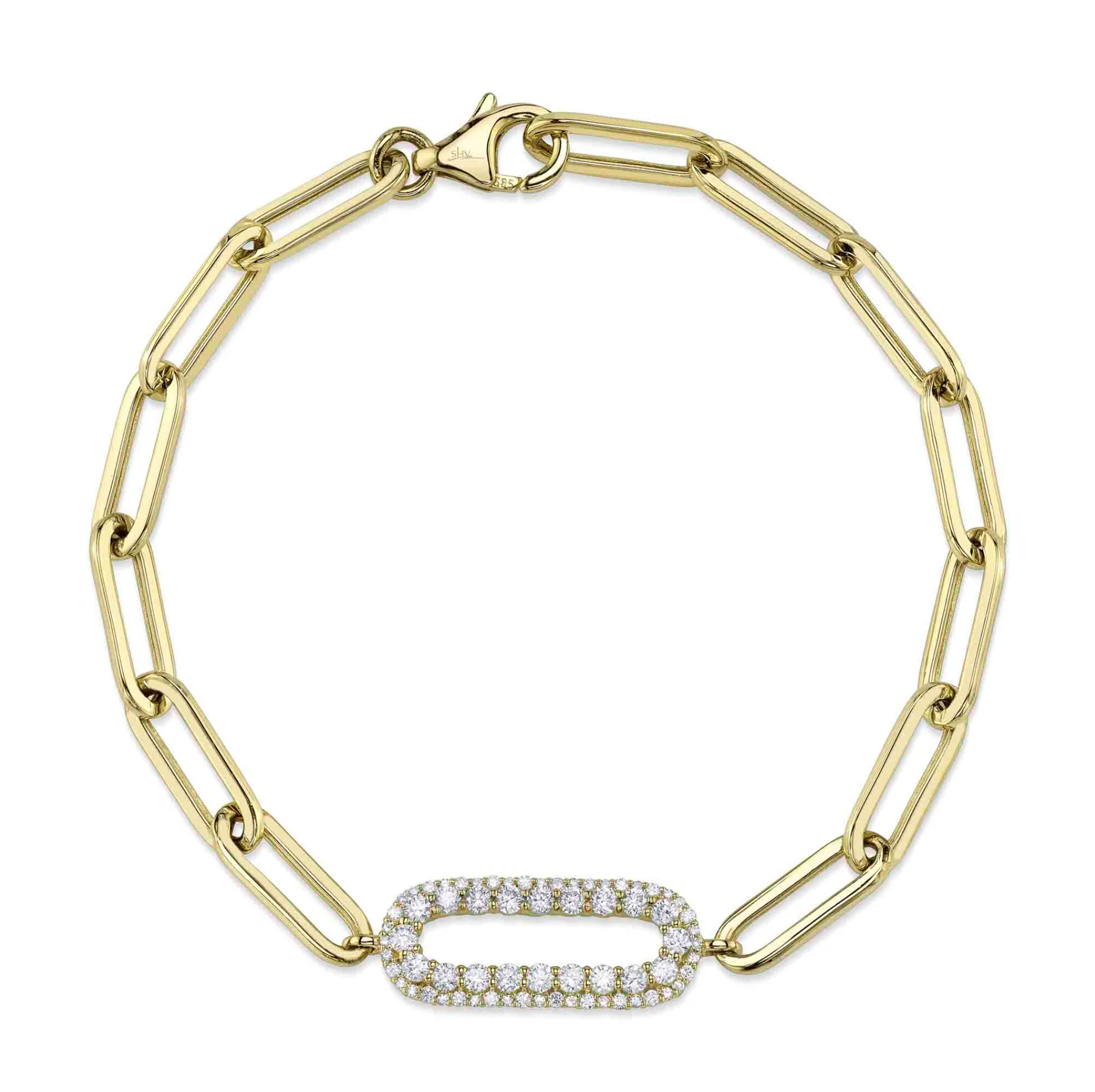 A Shy Creation "Paper Clip Link" bracelet featuring a single pave round brilliant-cut diamond center link, set in 14K yellow gold.