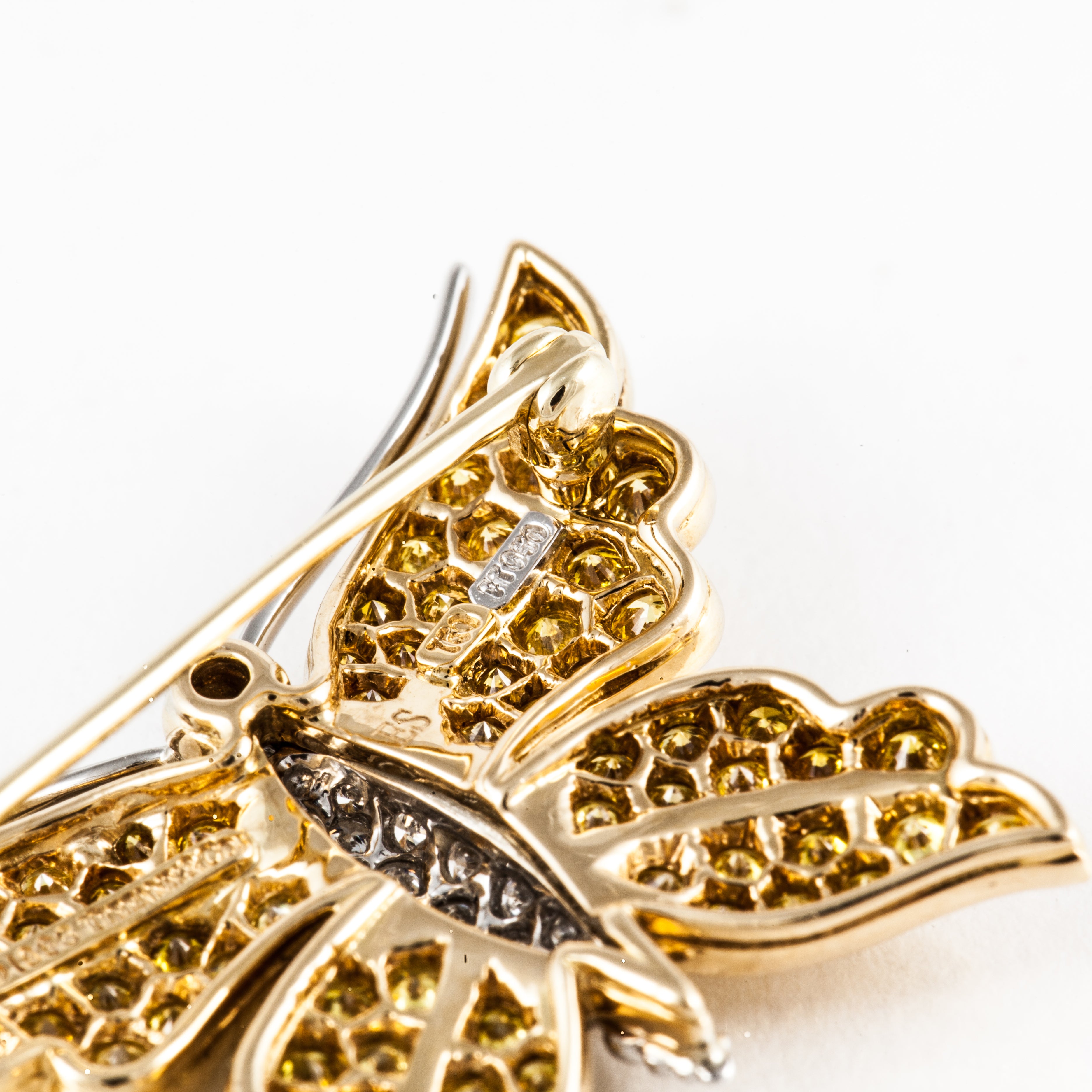 An estate Tiffany & Co. yellow and white pave diamond butterfly brooch in platinum and 18 karat yellow gold.