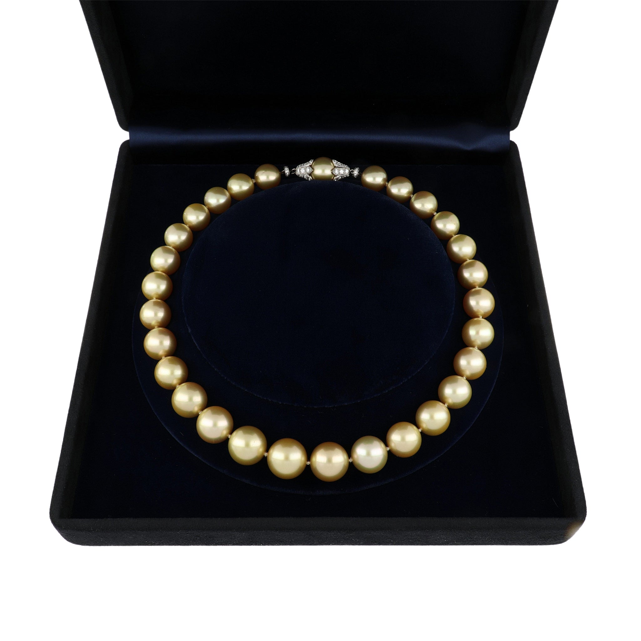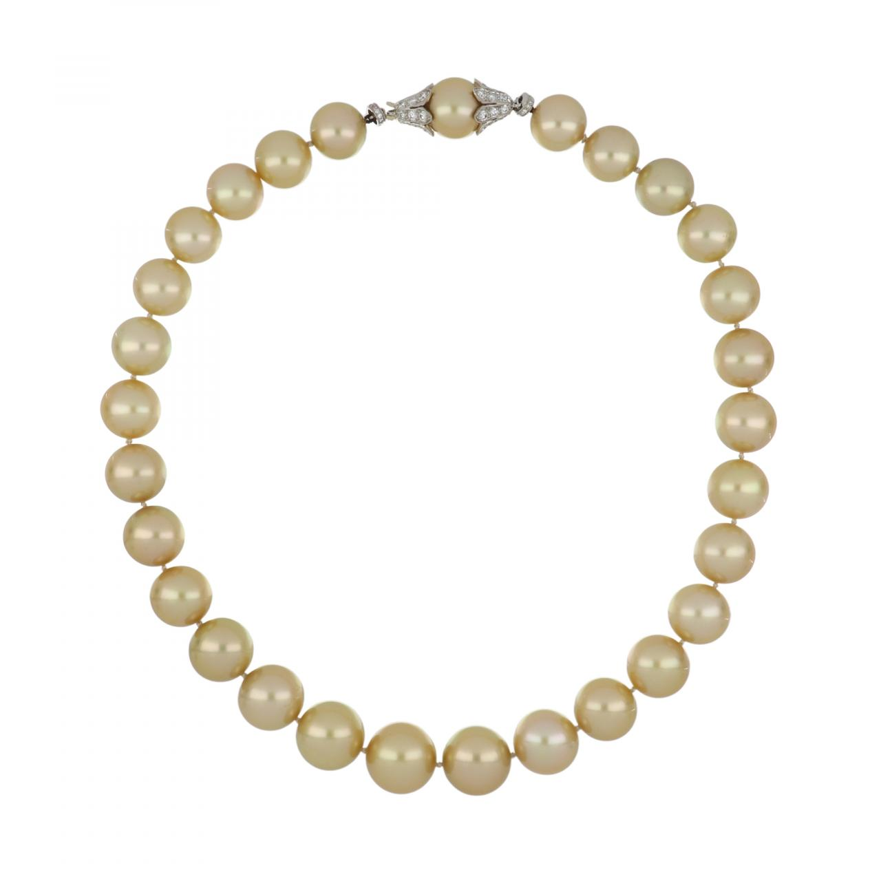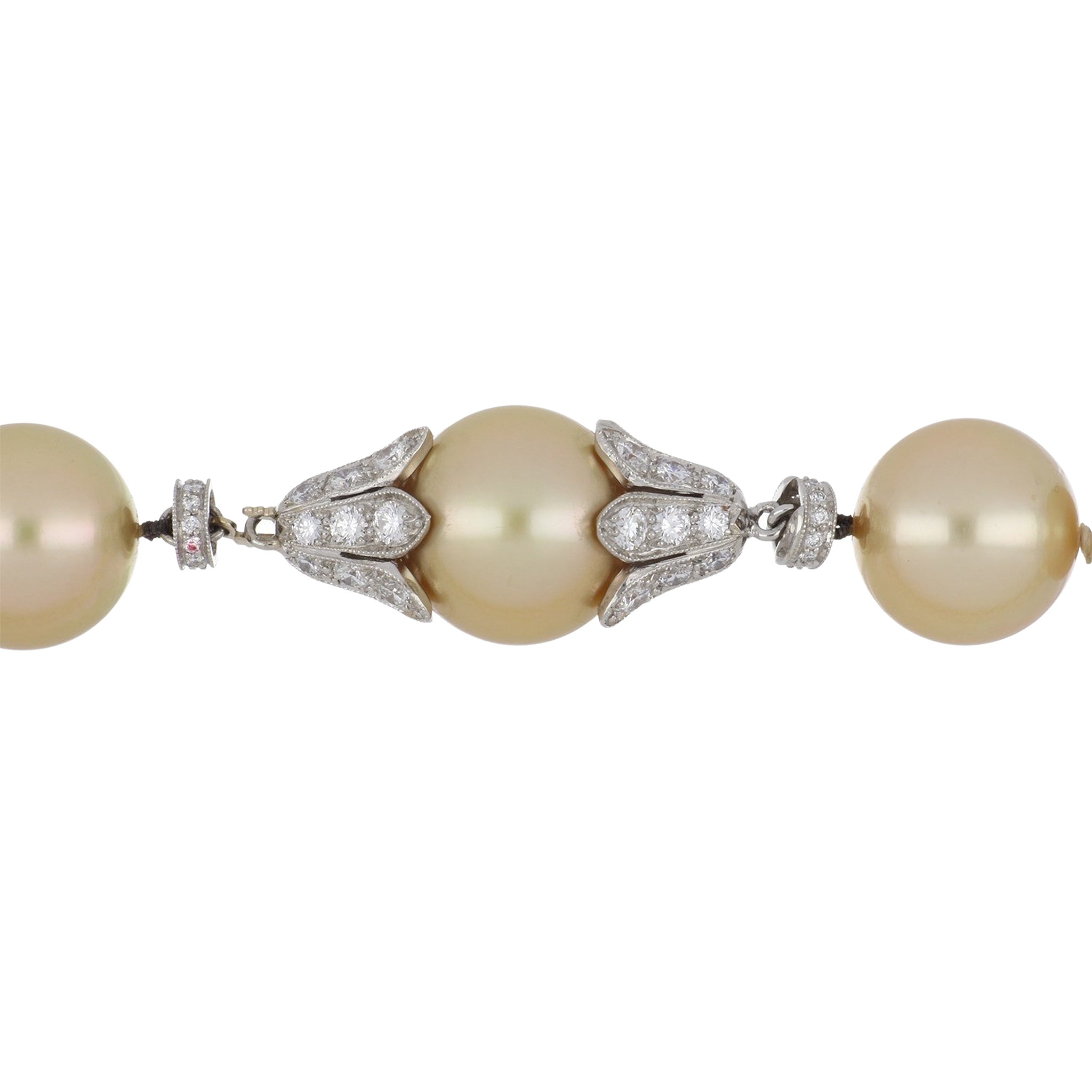 An estate vintage,Tiffany & Co. graduated golden South Sea pearl tulip necklace, with decorative pave diamond clasp in 18k white gold.