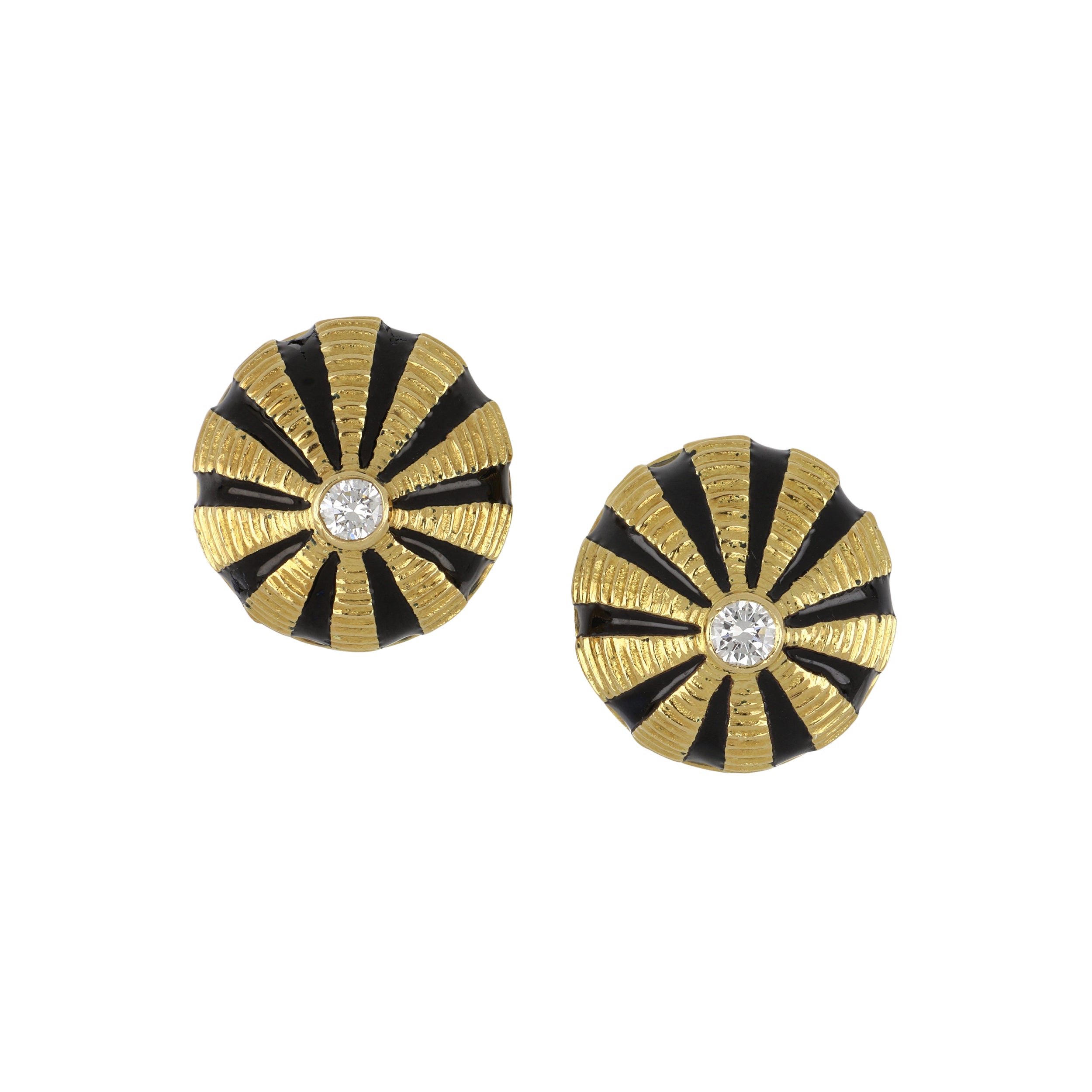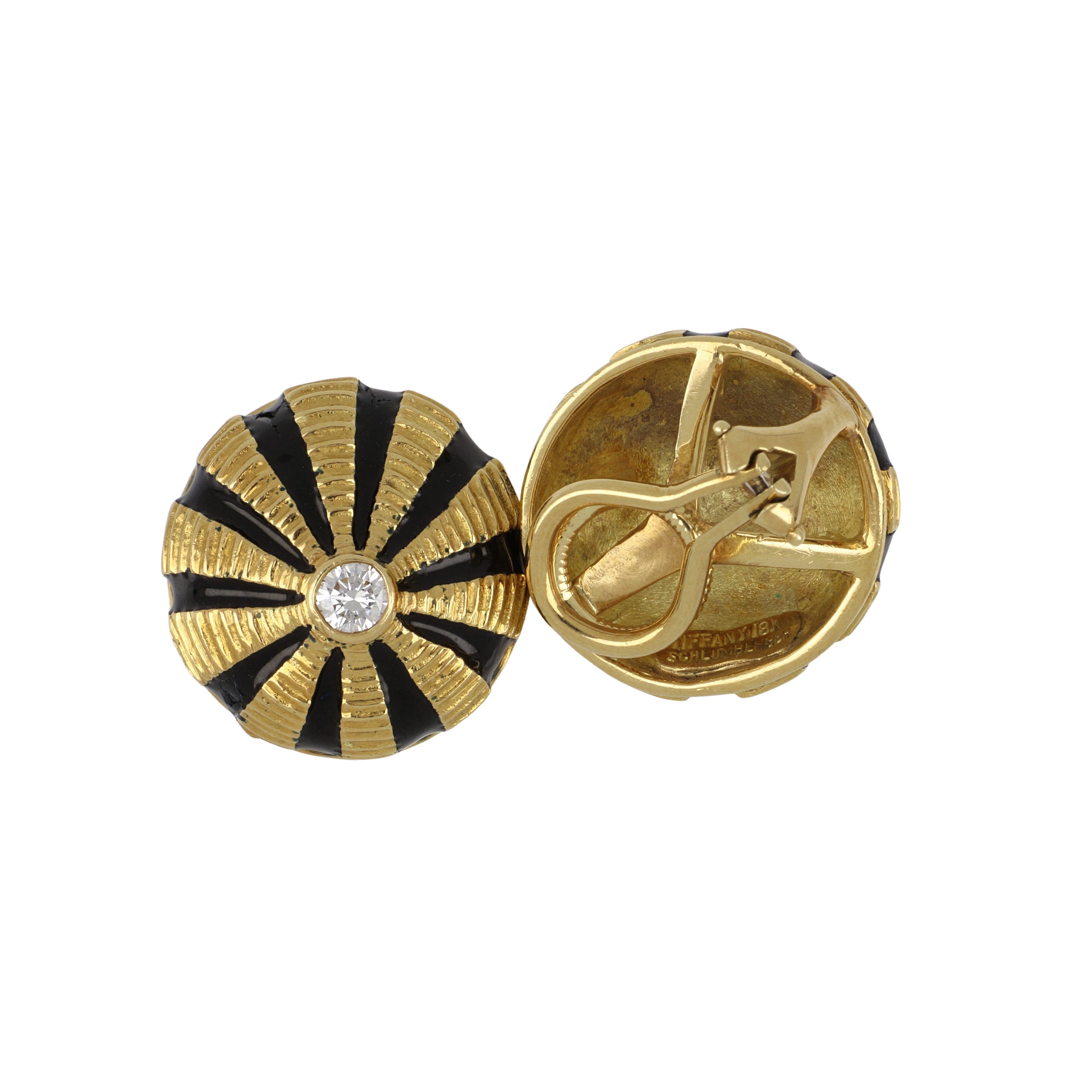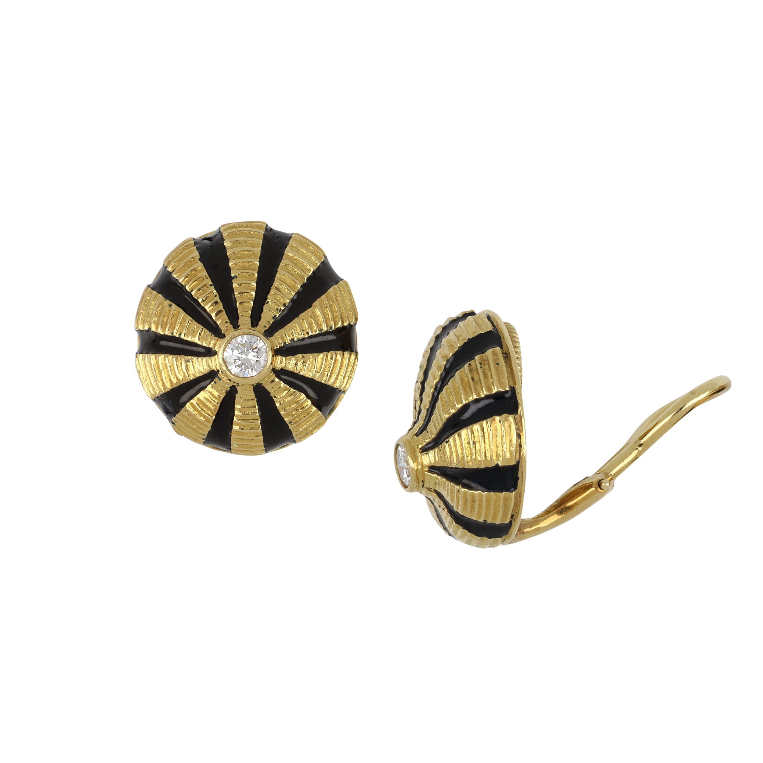 A pair of estate Tiffany & Co, Jean Schlumberger "Taj Mahal" textured 18K yellow gold earrings with black enamel stripes and central bezel-set round brilliant-cut diamonds.