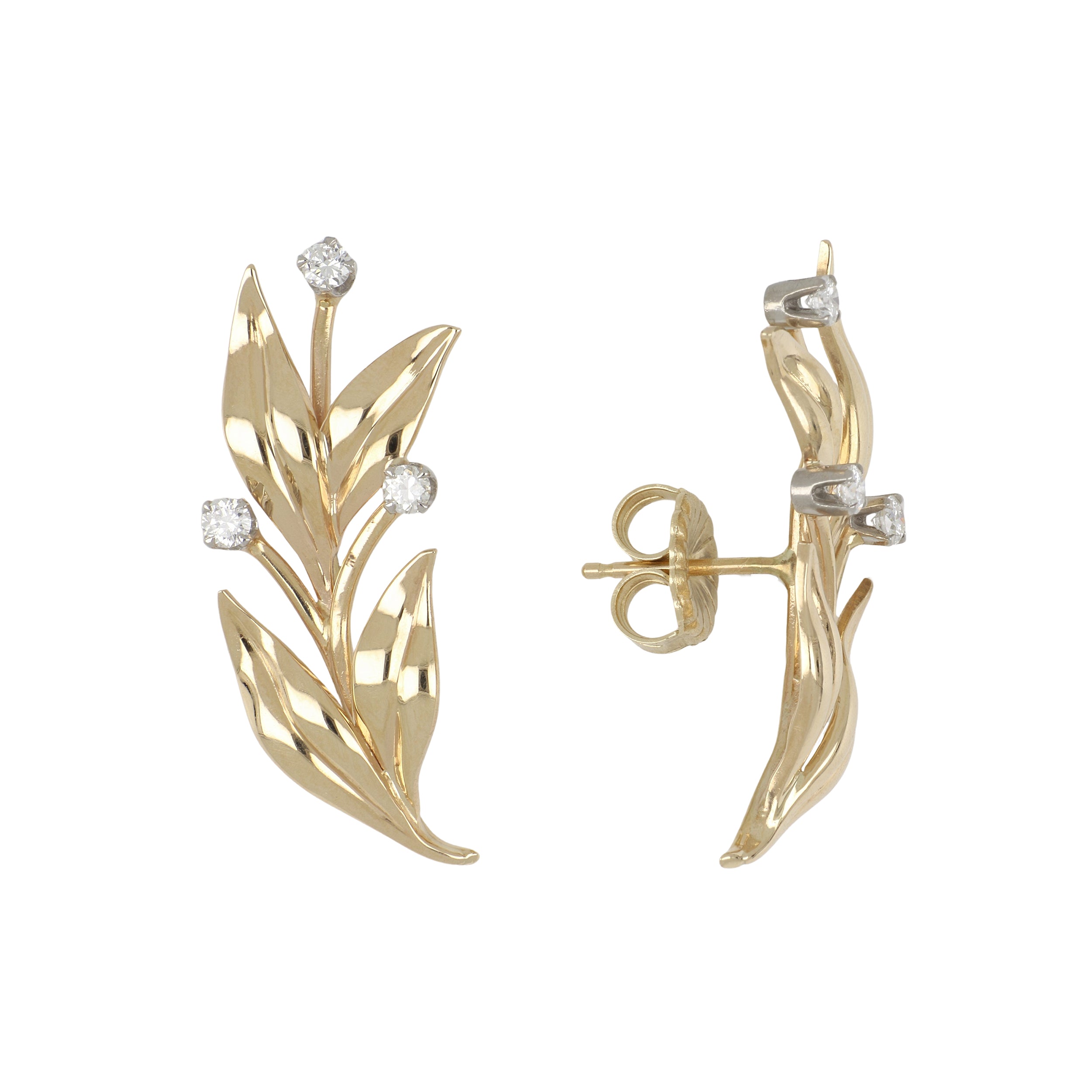 A pair of vintage Tiffany & Co, polished leaf earrings set with round brilliant-cut diamonds, in 14K yellow gold and platinum. Circa 1970.