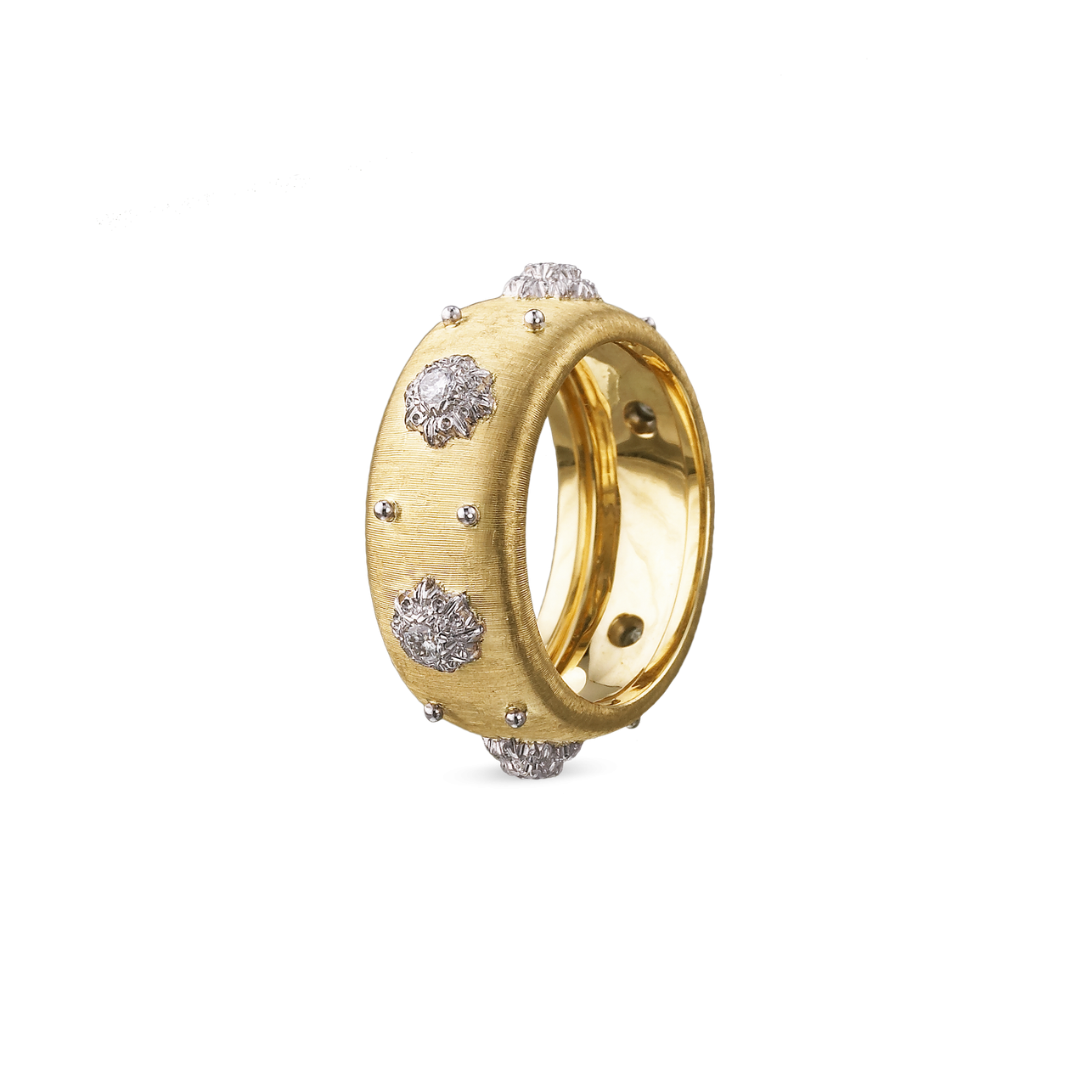 A Buccellati Macri Eternelle ring with with rigato effect engraving and diamonds, crafted in 18K yellow and white gold.