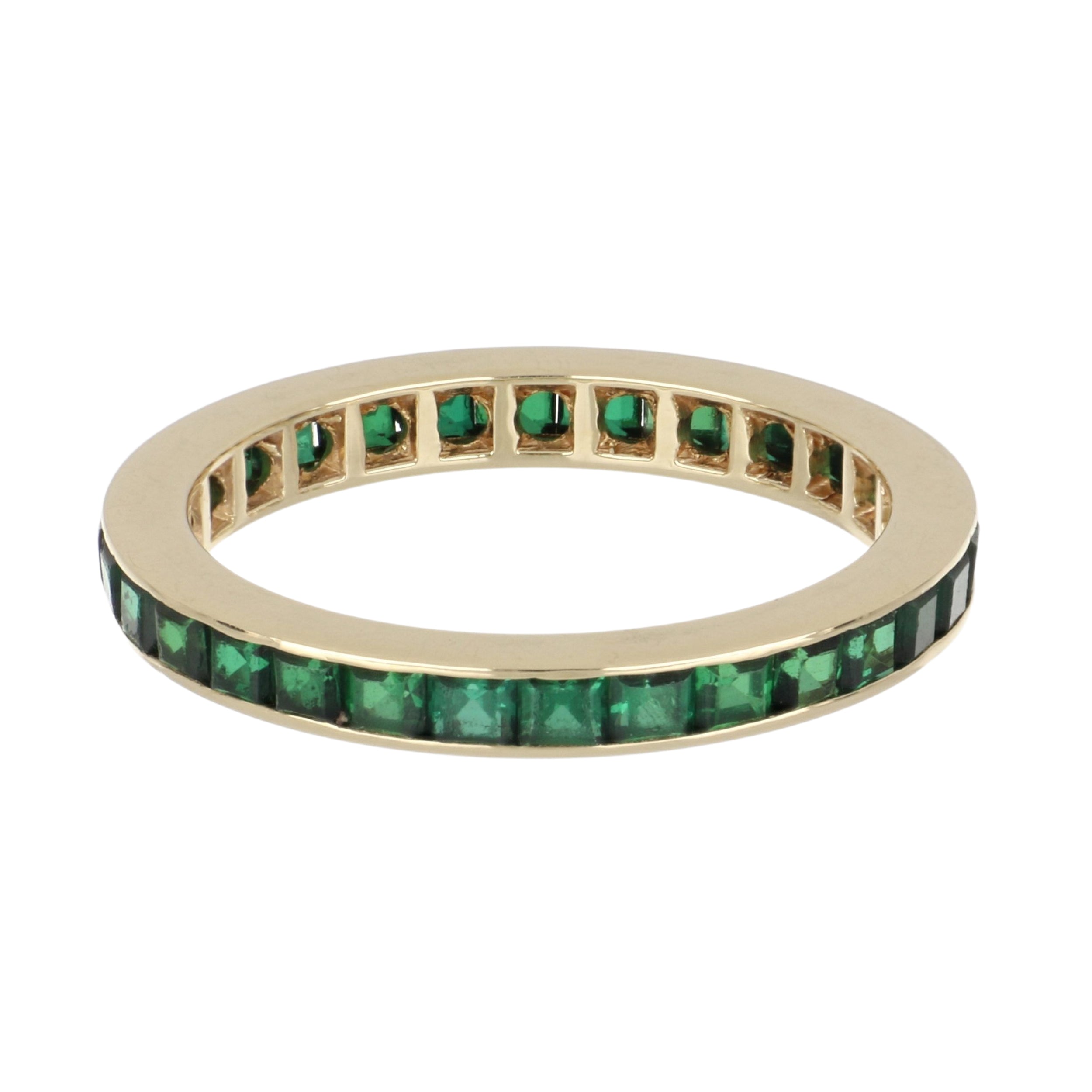 An estate channel-set square-cut tsavorite garnet eternity band in 14K yellow gold. Circa 2000.