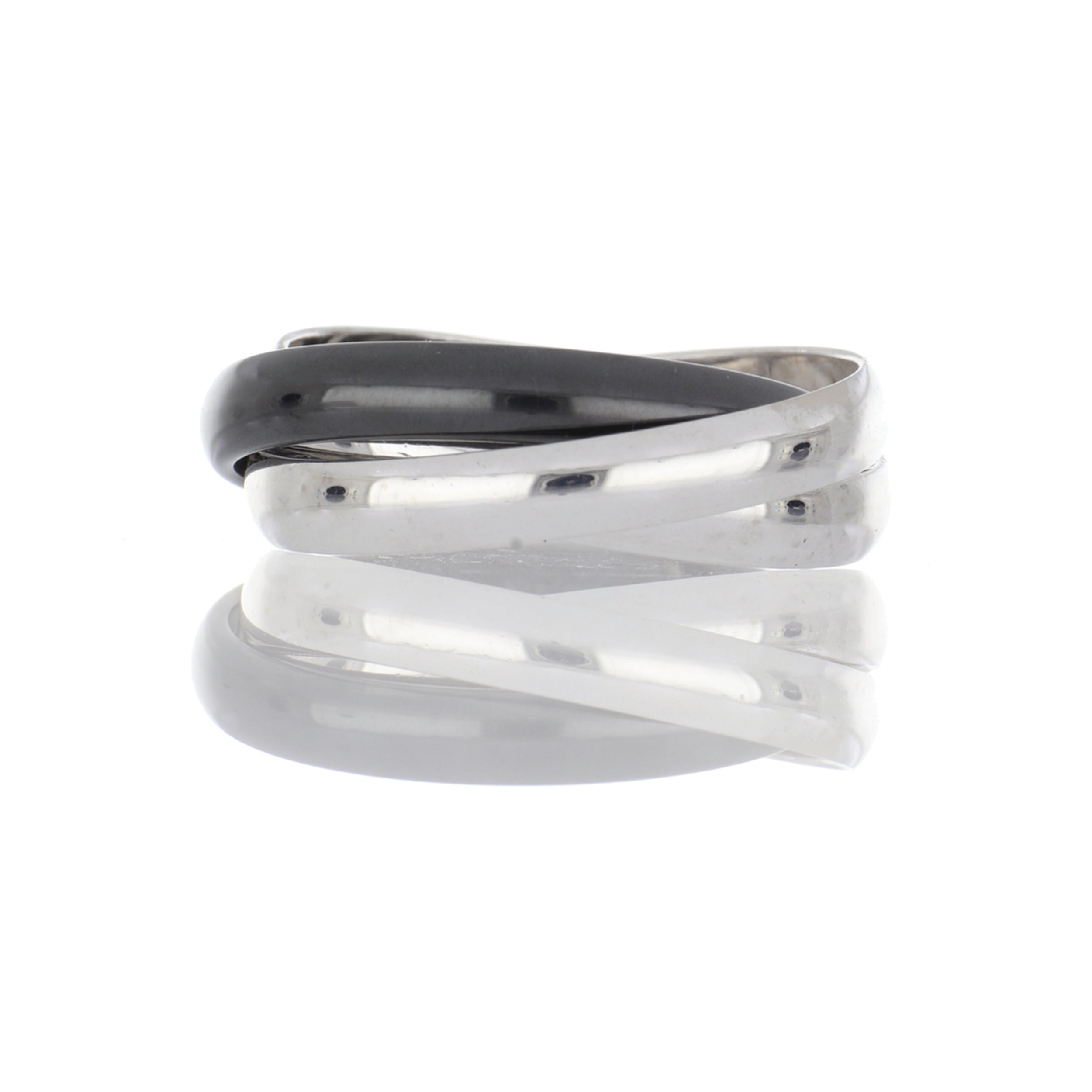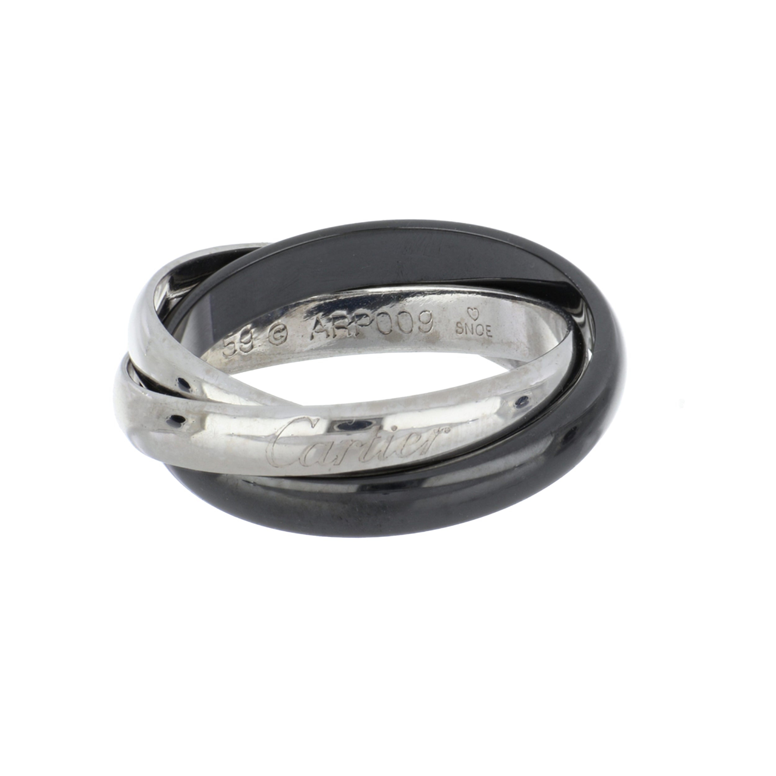 An estate Cartier 18K white gold and ceramic trinity ring. Accompanied with a box and certificate of authentication. Circa 2010.