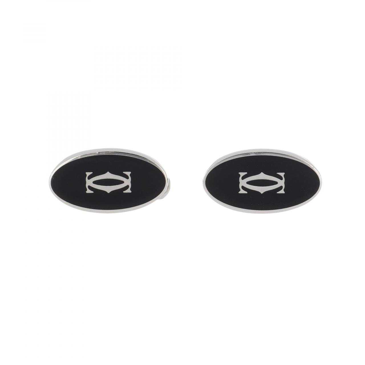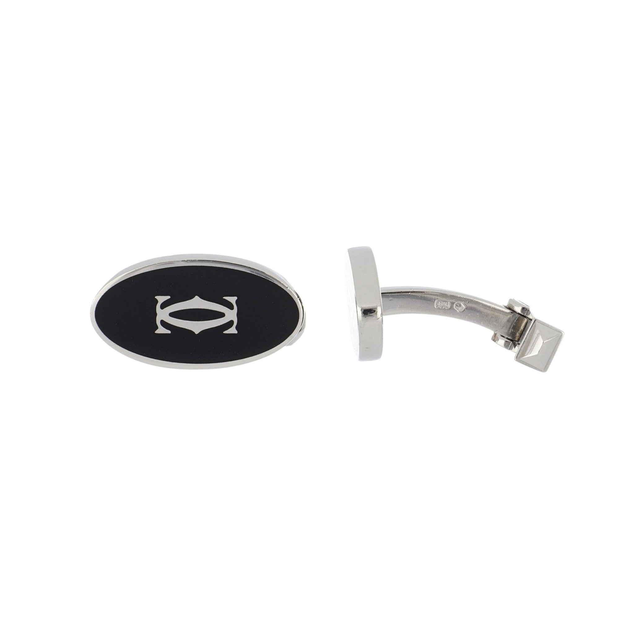 A pair of estate Cartier sterling silver black enamel cufflinks with interlocking "c"s.
