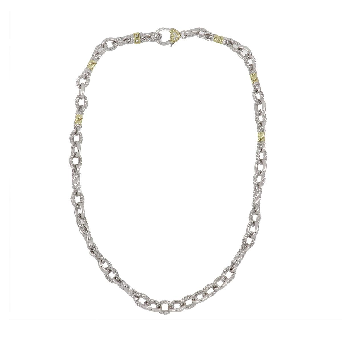 An estate Judith Ripka sterling silver & 18K yellow gold necklace with diamonds. Has a removable heart charm pendant with a pink stone and diamonds.