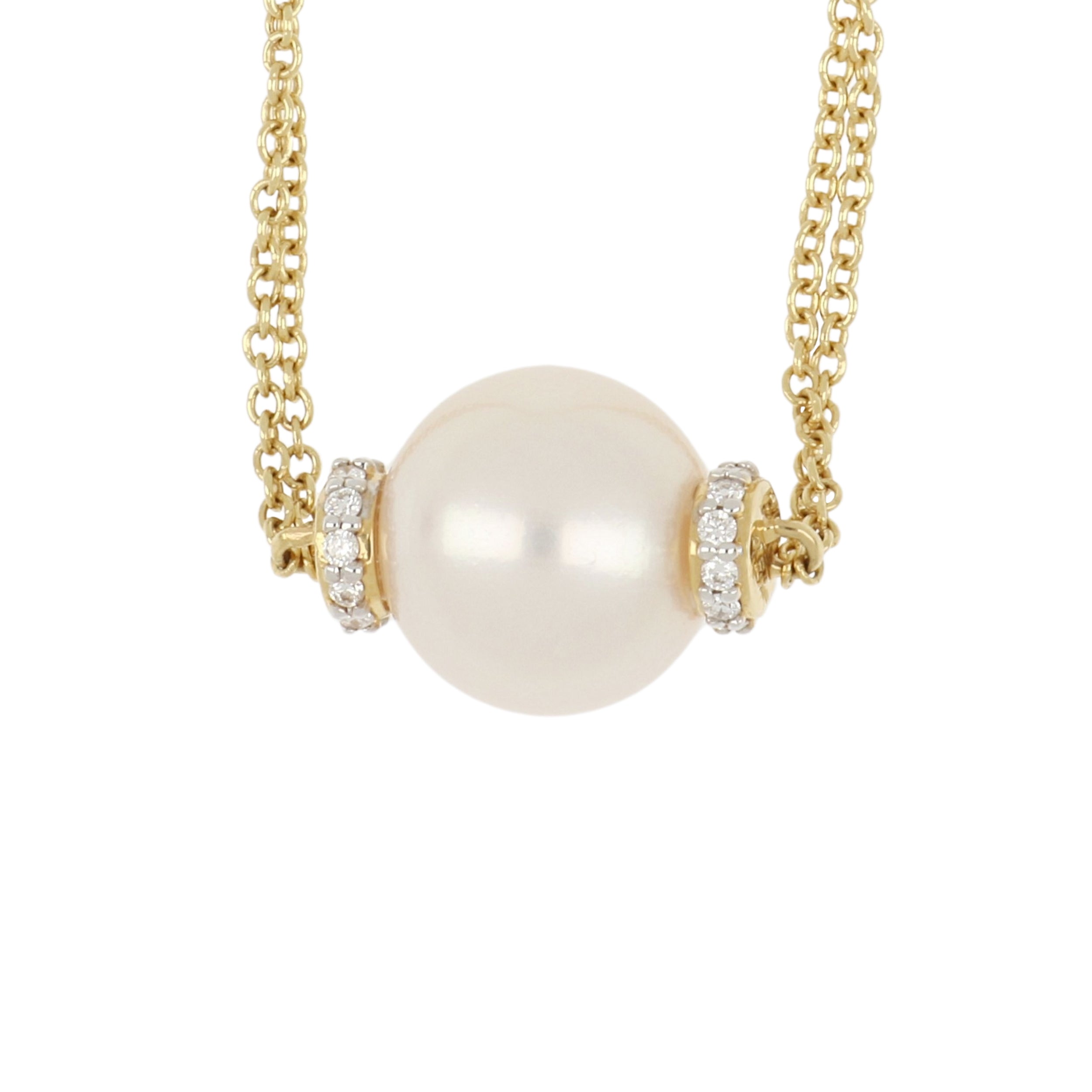 A Mastoloni freshwater pearl pendant necklace with diamond details, on an 18K yellow gold double chain.