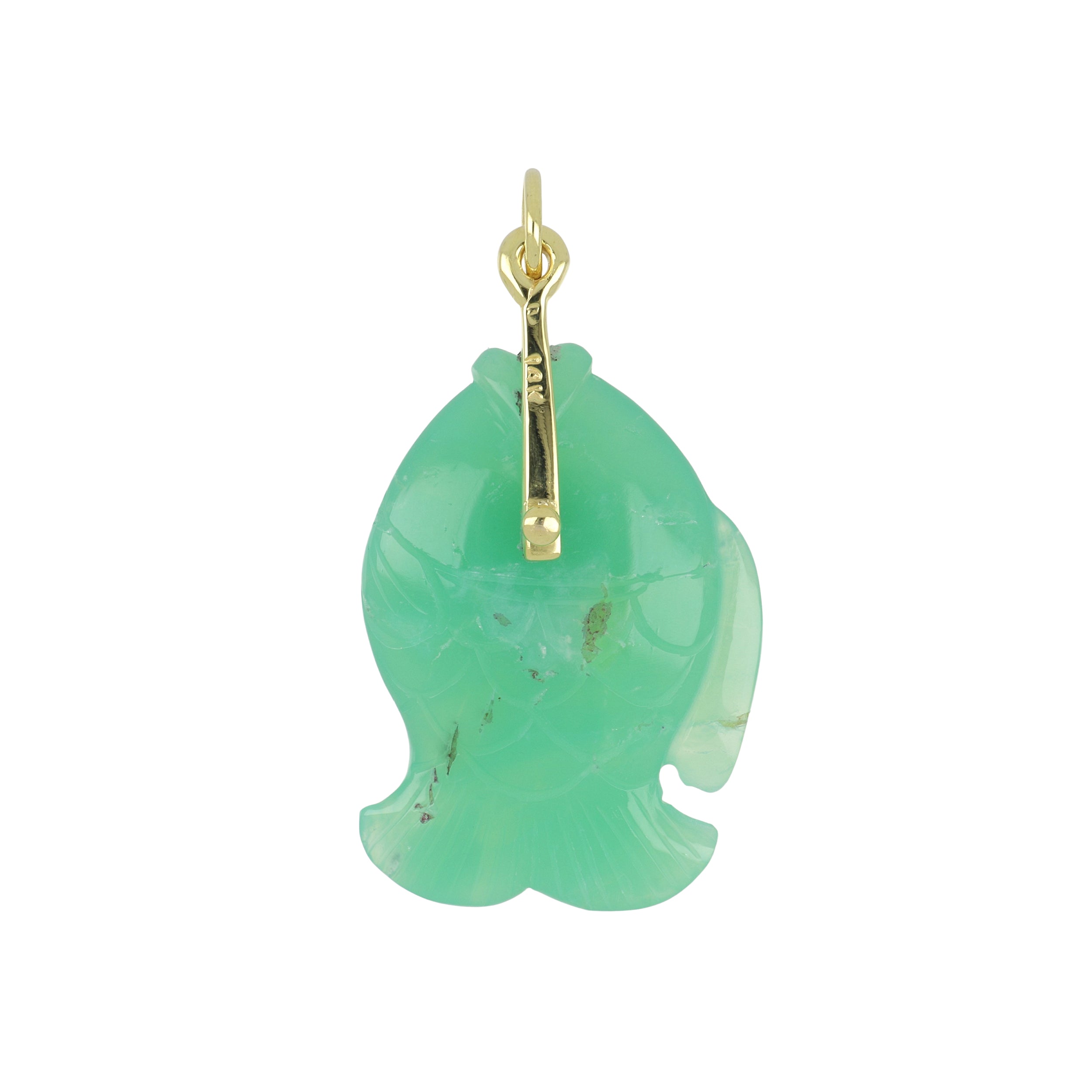 A Mazza carved green chalcedony fish pendant with a tsavorite eye, set in 14K yellow gold.