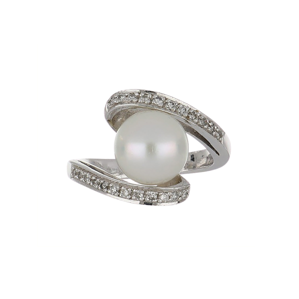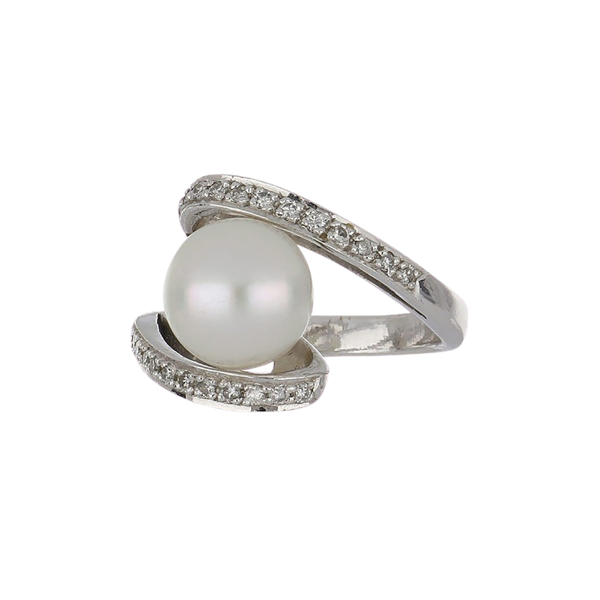 An 18K white gold cultured pearl and diamond bypass ring. Circa 2010.