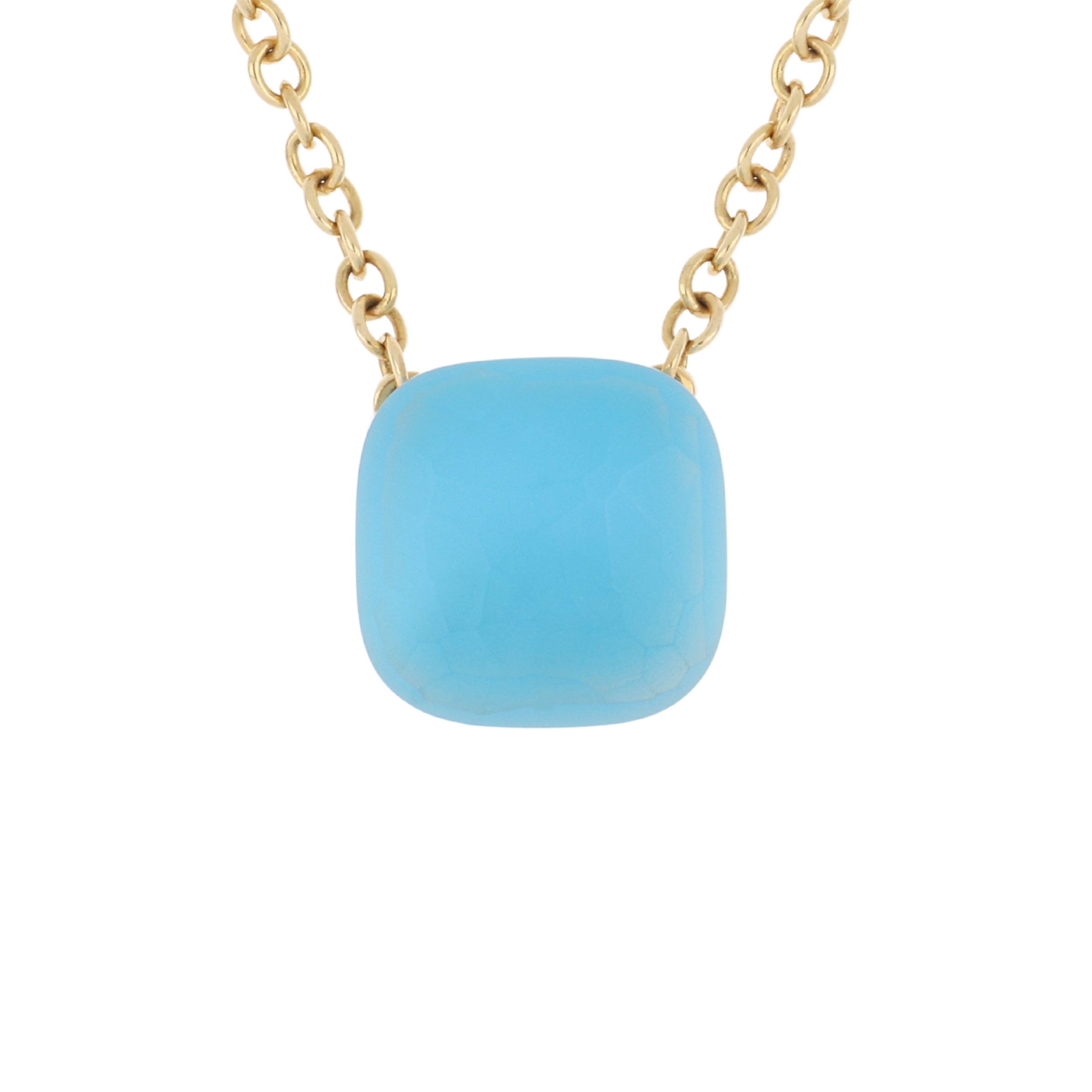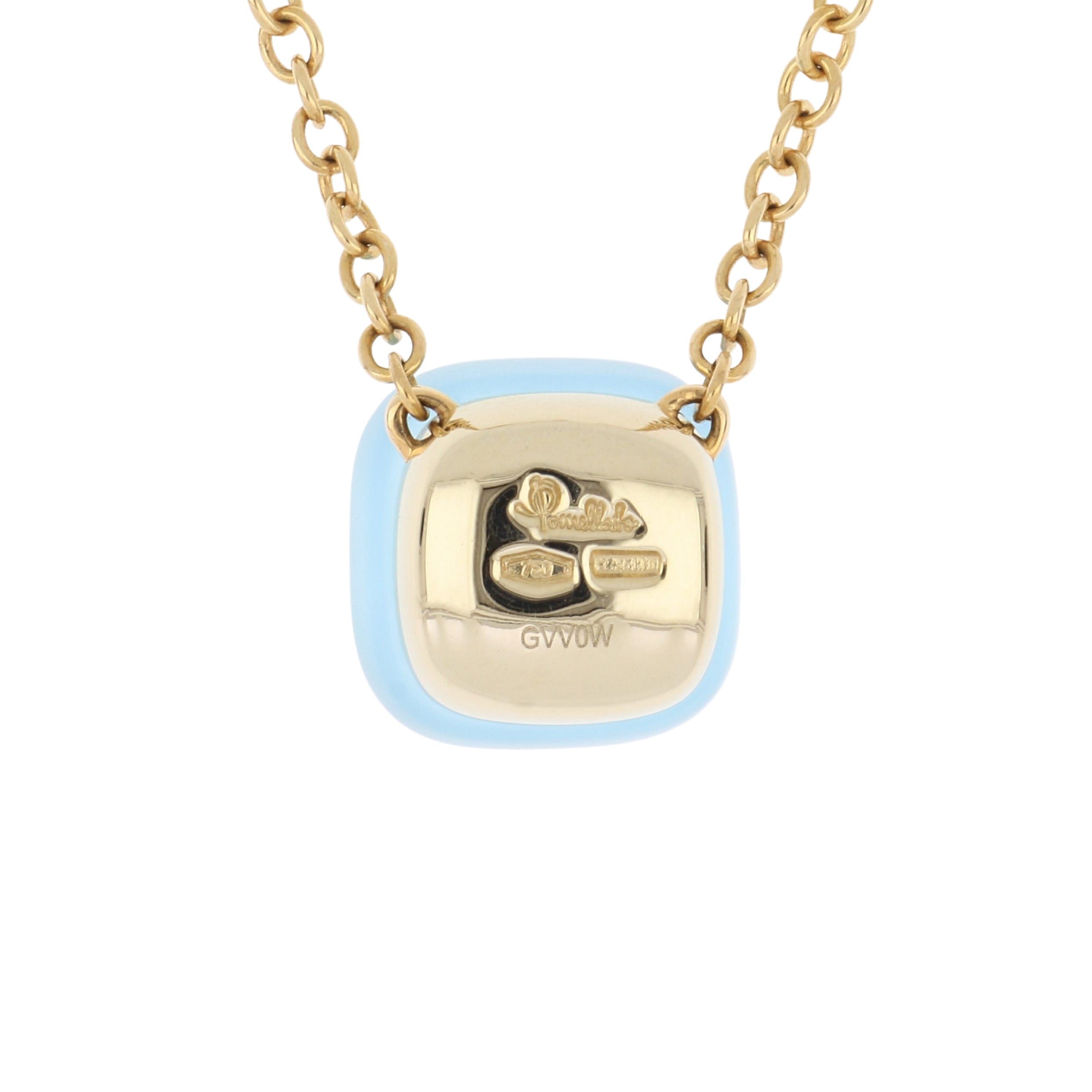 A Pomellato sky blue topaz, mother-of-pearl, and turquoise doublet Nudo Gele pendant necklace, set in 18K white and rose gold.