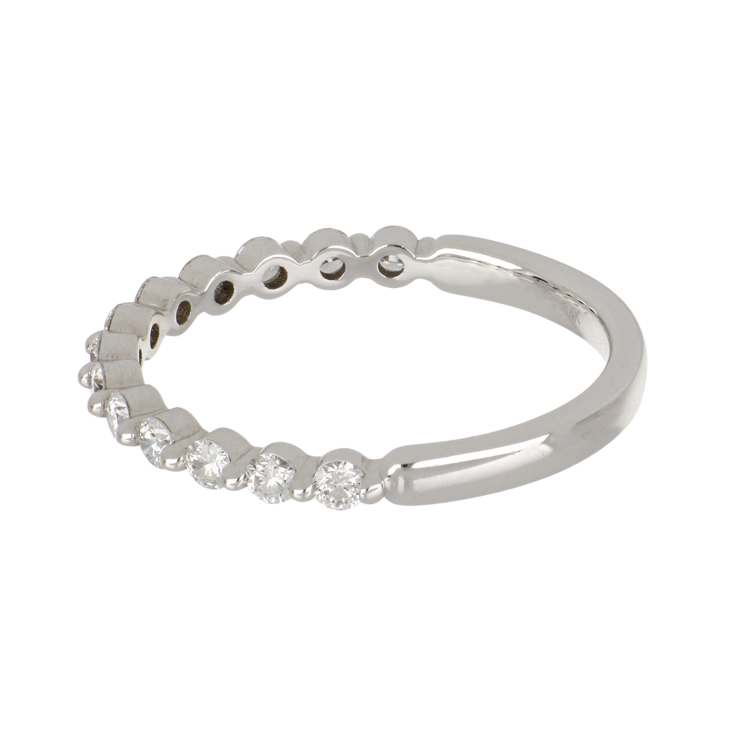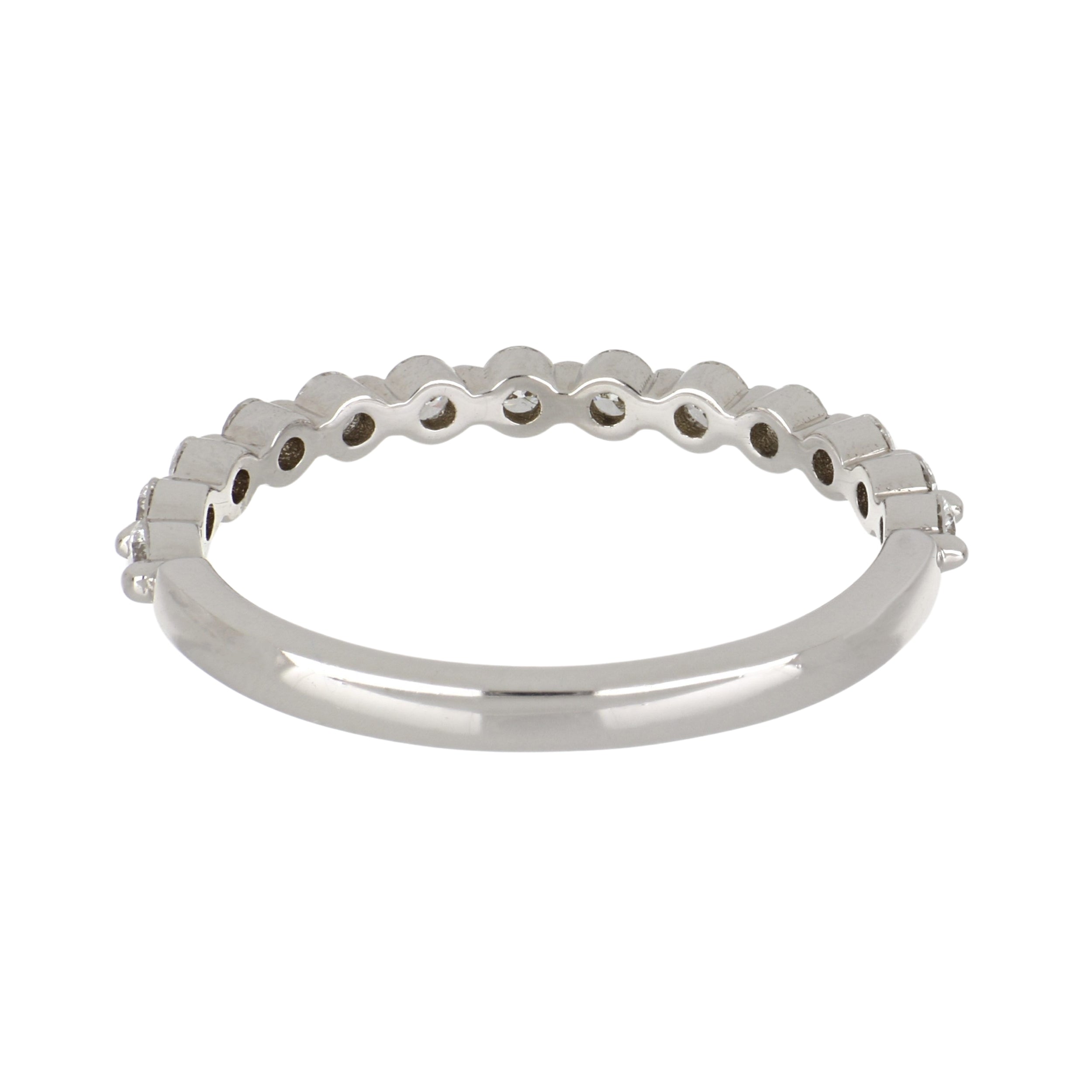 A shared prong round brilliant-cut diamond band, set in 14K white gold.