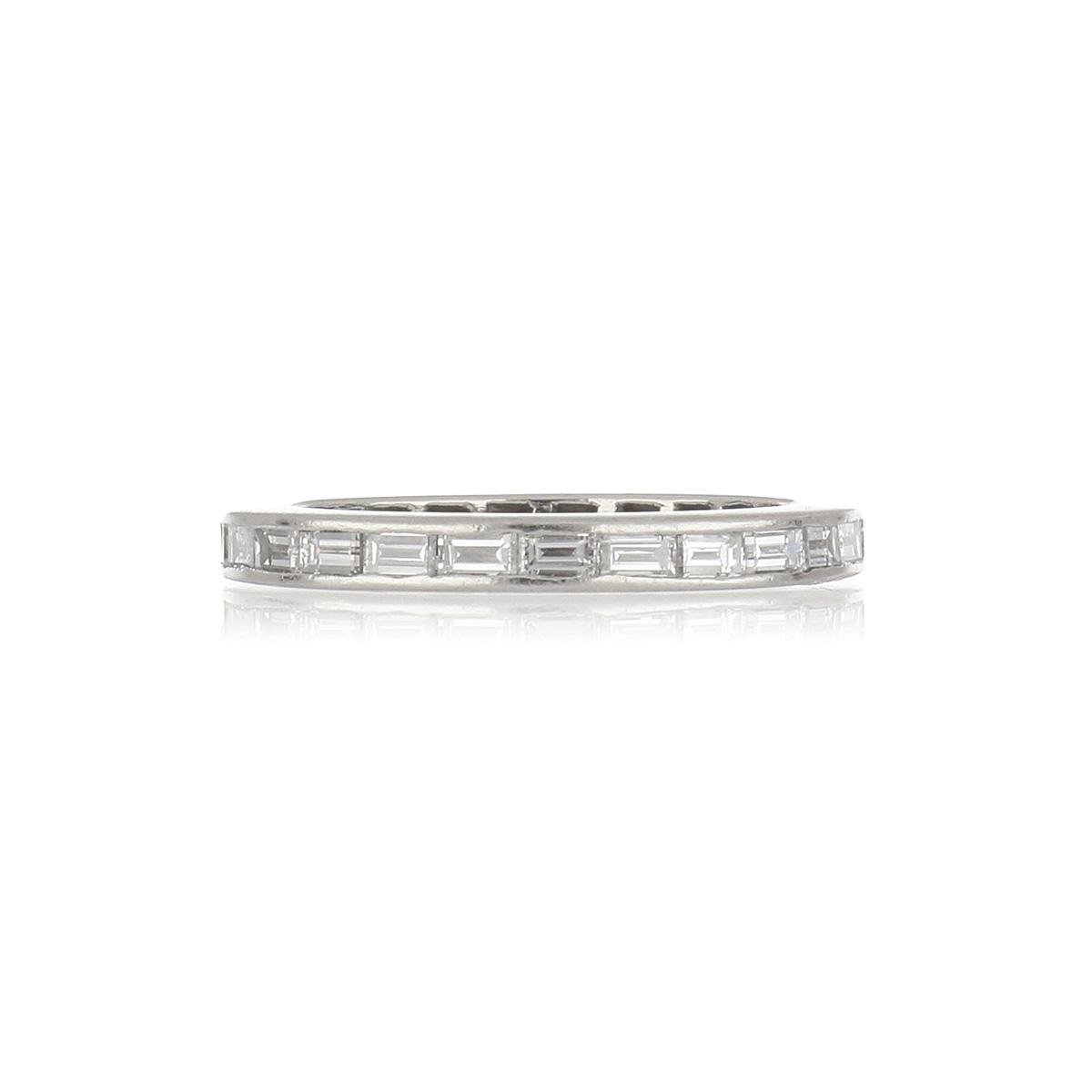 An estate vintage, channel-set east-west, baguette-cut diamond eternity band set in platinum.