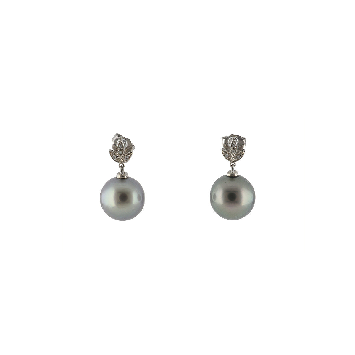 A pair of 14K white gold pearl and diamond drop earrings.