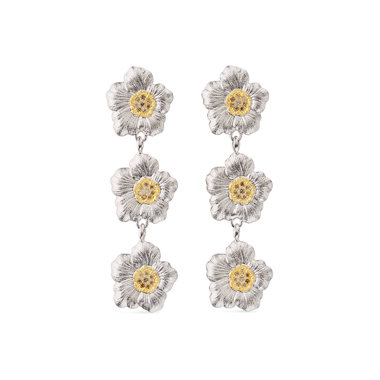 A new pair of Buccellati Gardenia Blossom triple drop pendant earrings set with diamonds in sterling silver with yellow gold with plated accents.