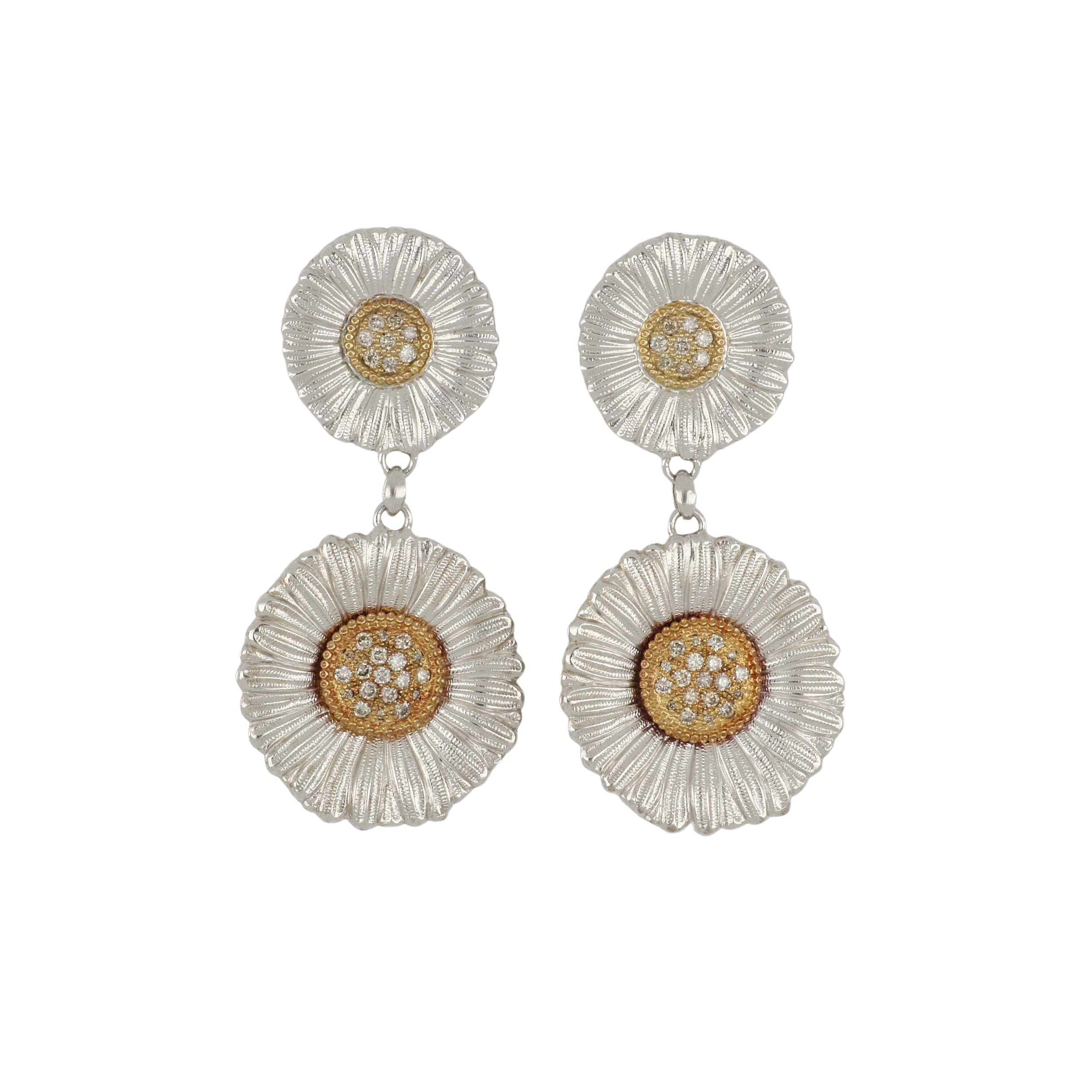 A pair of Buccellati Daisy Blossom pendant drop earrings with diamonds, set in sterling silver and yellow gold.