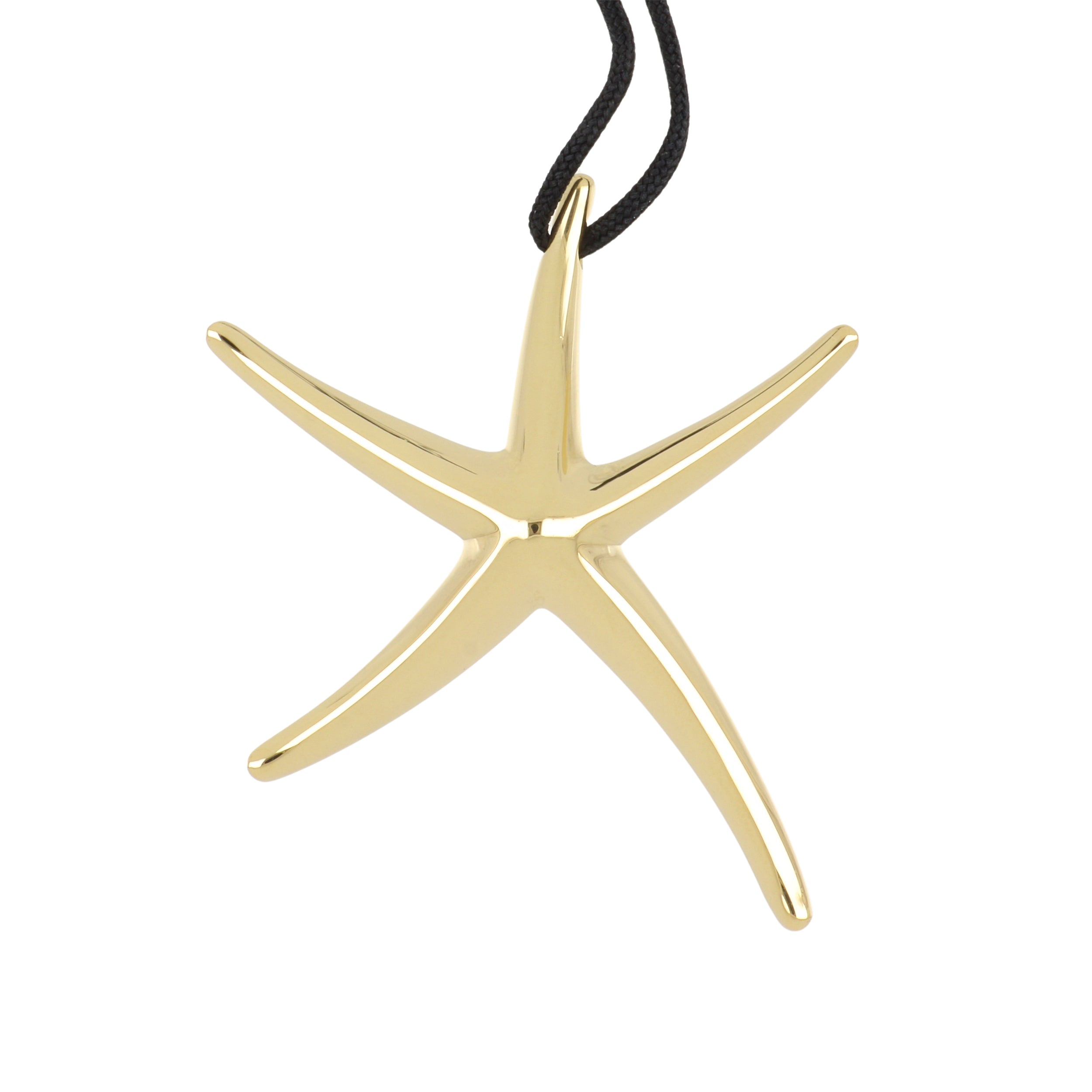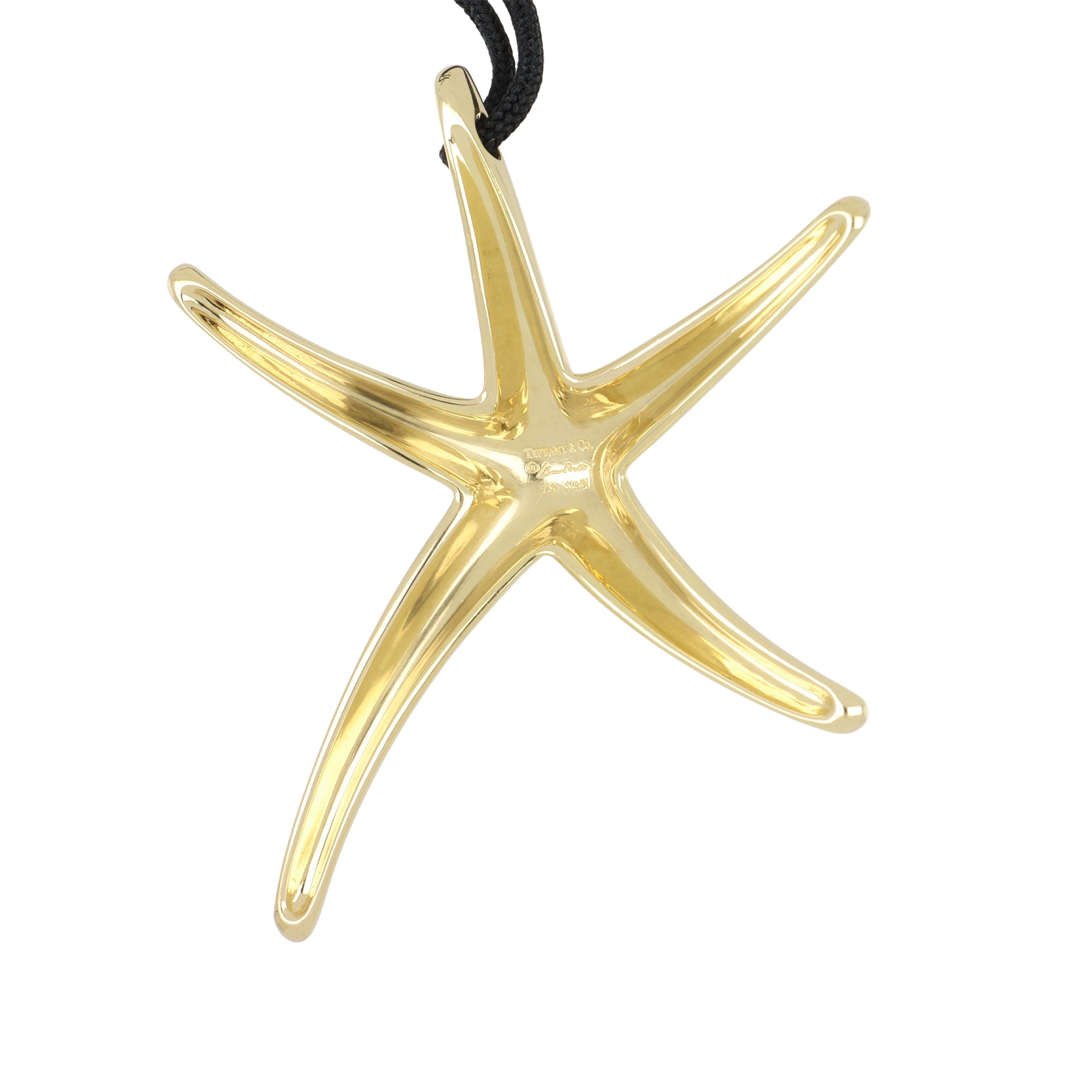 An estate Tiffany & Co. Elsa Peretti 18K yellow gold starfish pendant necklace on a black cord. Circa 2020. Signed: Tiffany & Co. Elsa Peretti, Spain.