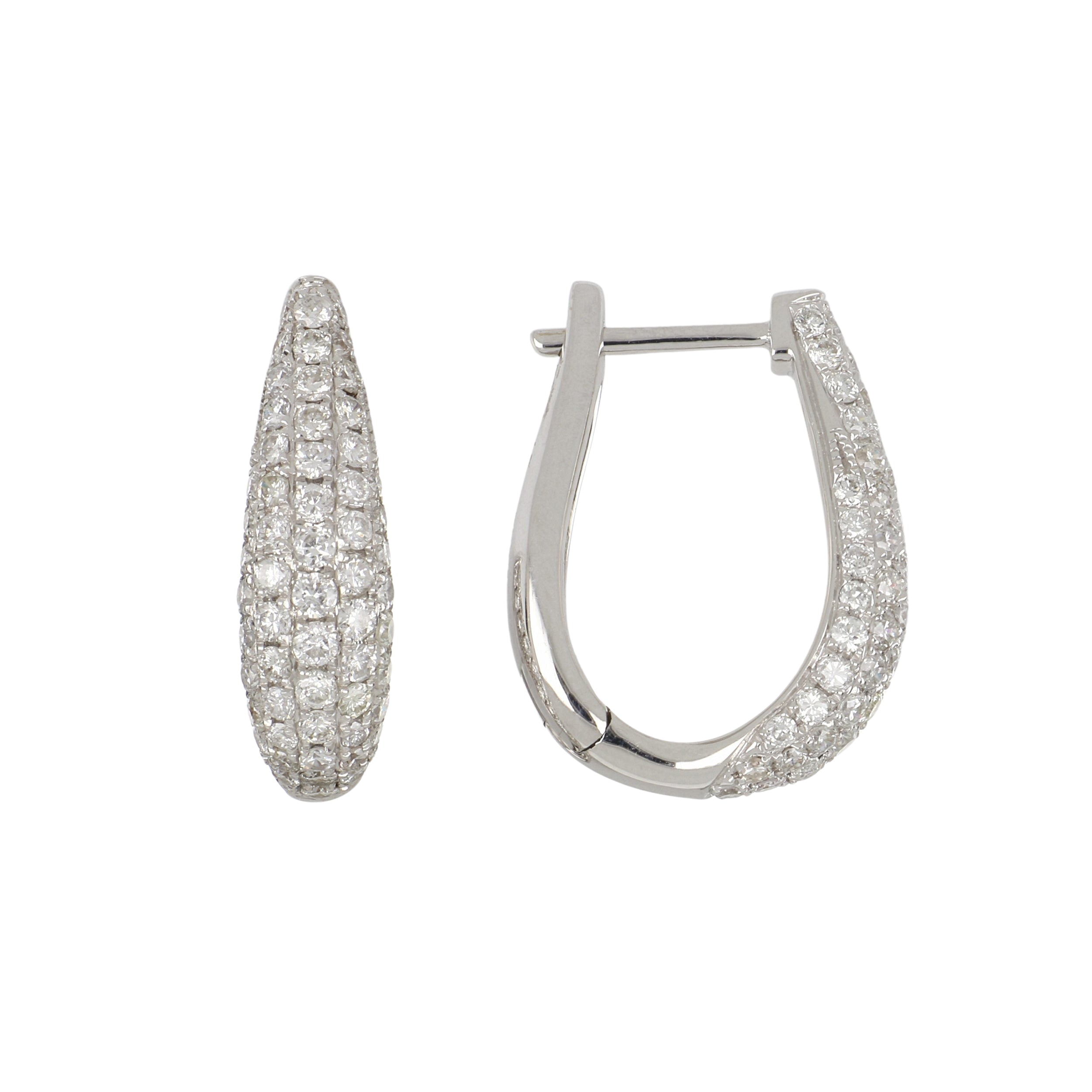 A pair of pave round brilliant-cut diamond tapered hoop earrings, set in 18K white gold.