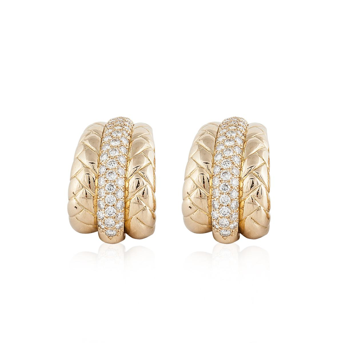 A pair of estate Van Cleef & Arpels braided pave round brilliant-cut diamond hoop earrings, in 18K yellow gold.