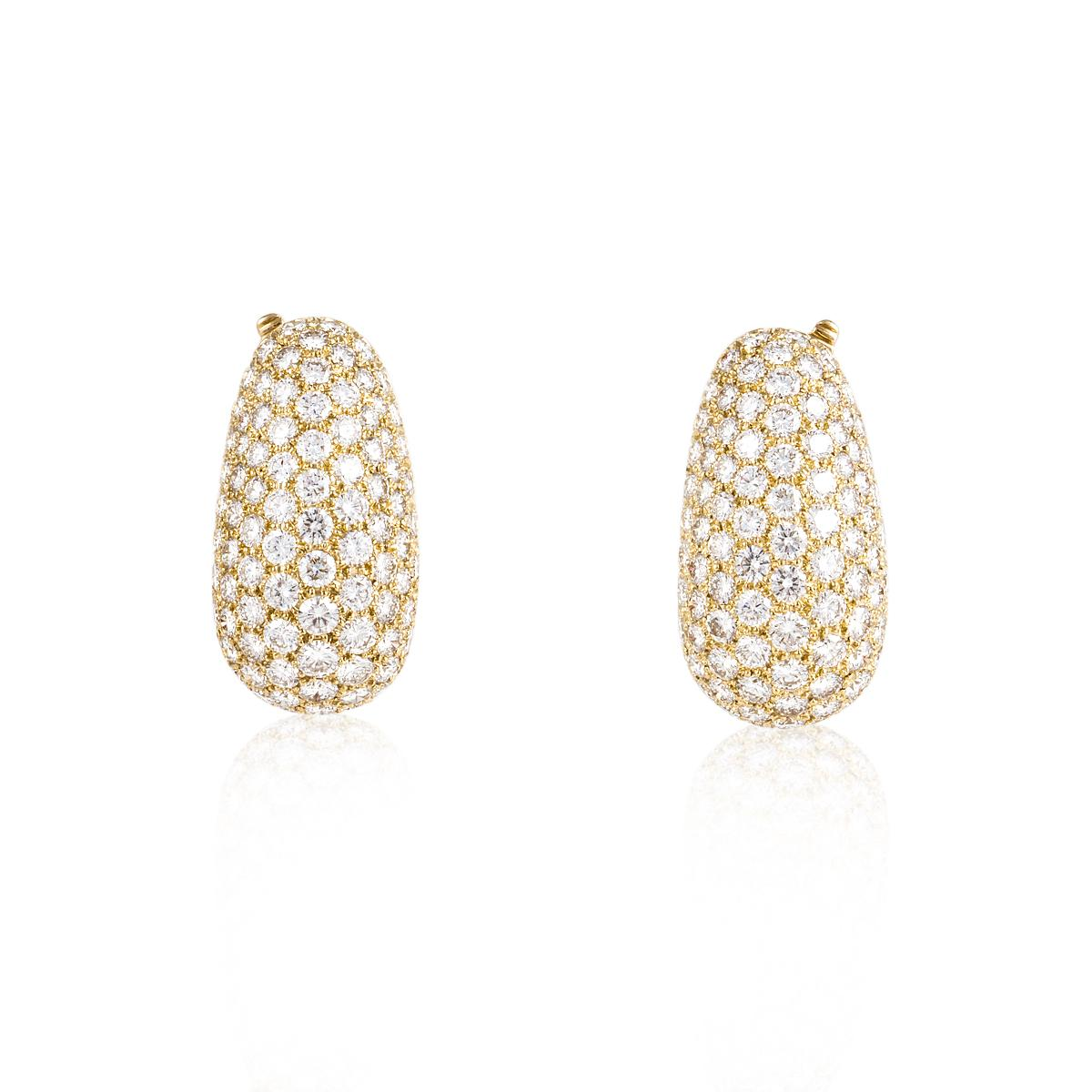 A pair of estate vintage, Van Cleef & Arpels pave round brilliant-cut diamond clip earrings set in 18K yellow gold. Circa 1990.