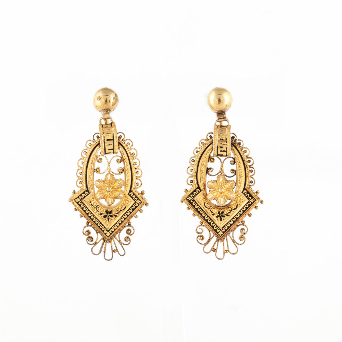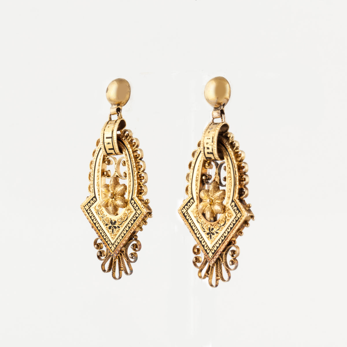 A pair of antique Victorian earrings with black tracery enamel, set in 14K yellow gold. Circa 1860