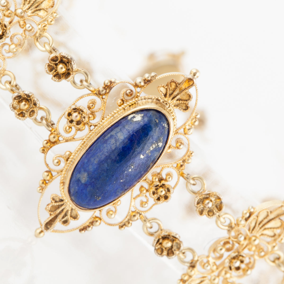 A Victorian Etruscan Revival 12K yellow gold filigree link bracelet, with oval cabochon lapis. Circa 1870.Antique CollectionLength: 7.75 inches
