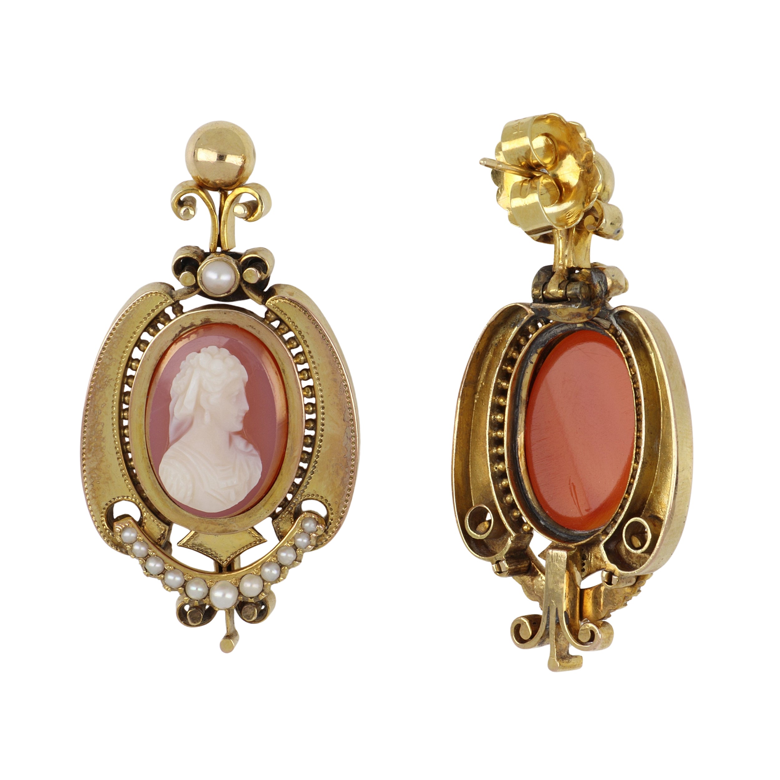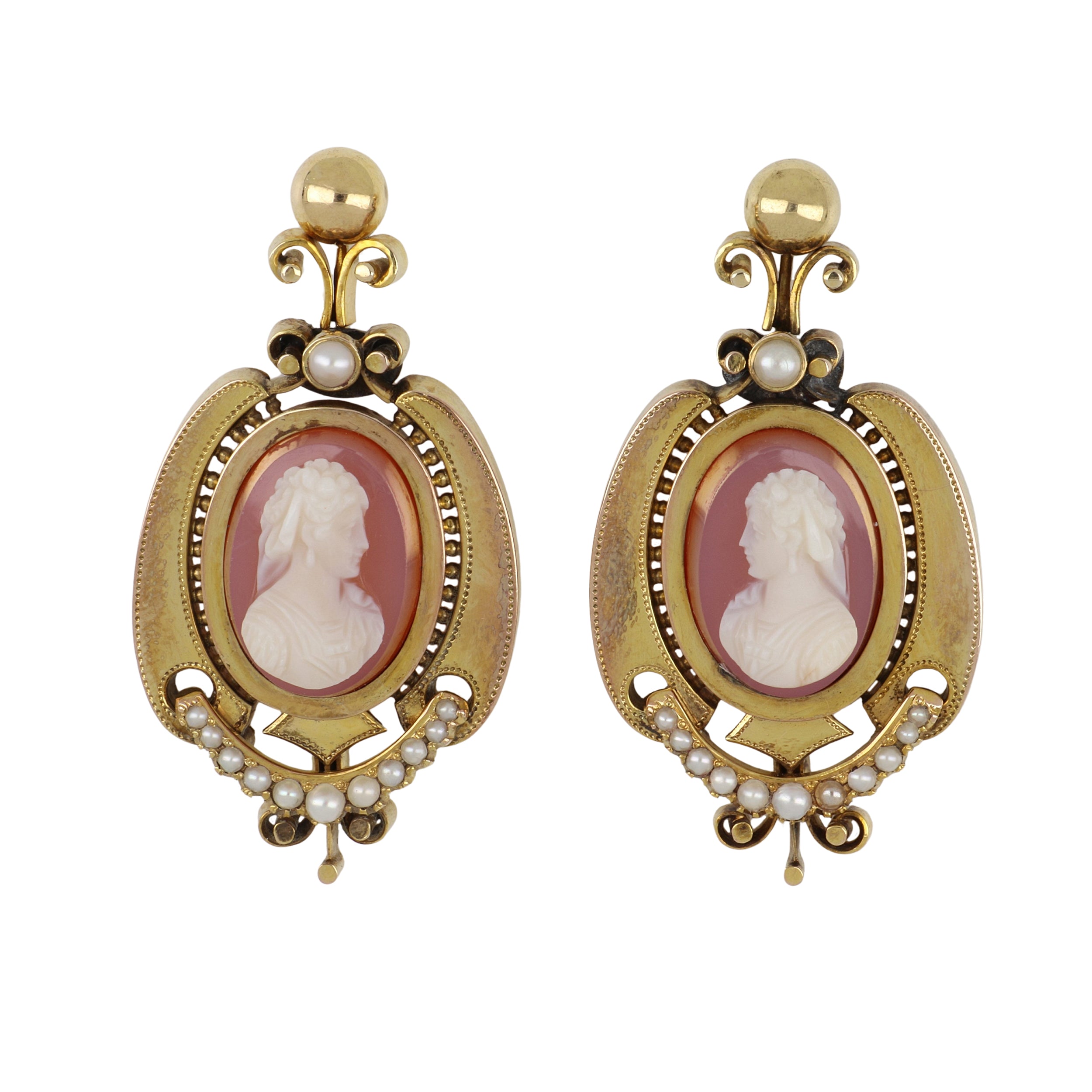 A pair of Victorian carved agate cameo earrings, depicting the bust of a Victorian-era woman with pearl accents, set in 14K yellow gold. Circa 1890.