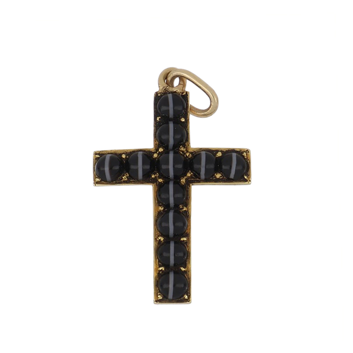 A Victorian cabochon-cut banded agate cross pendant set in 14K yellow gold.