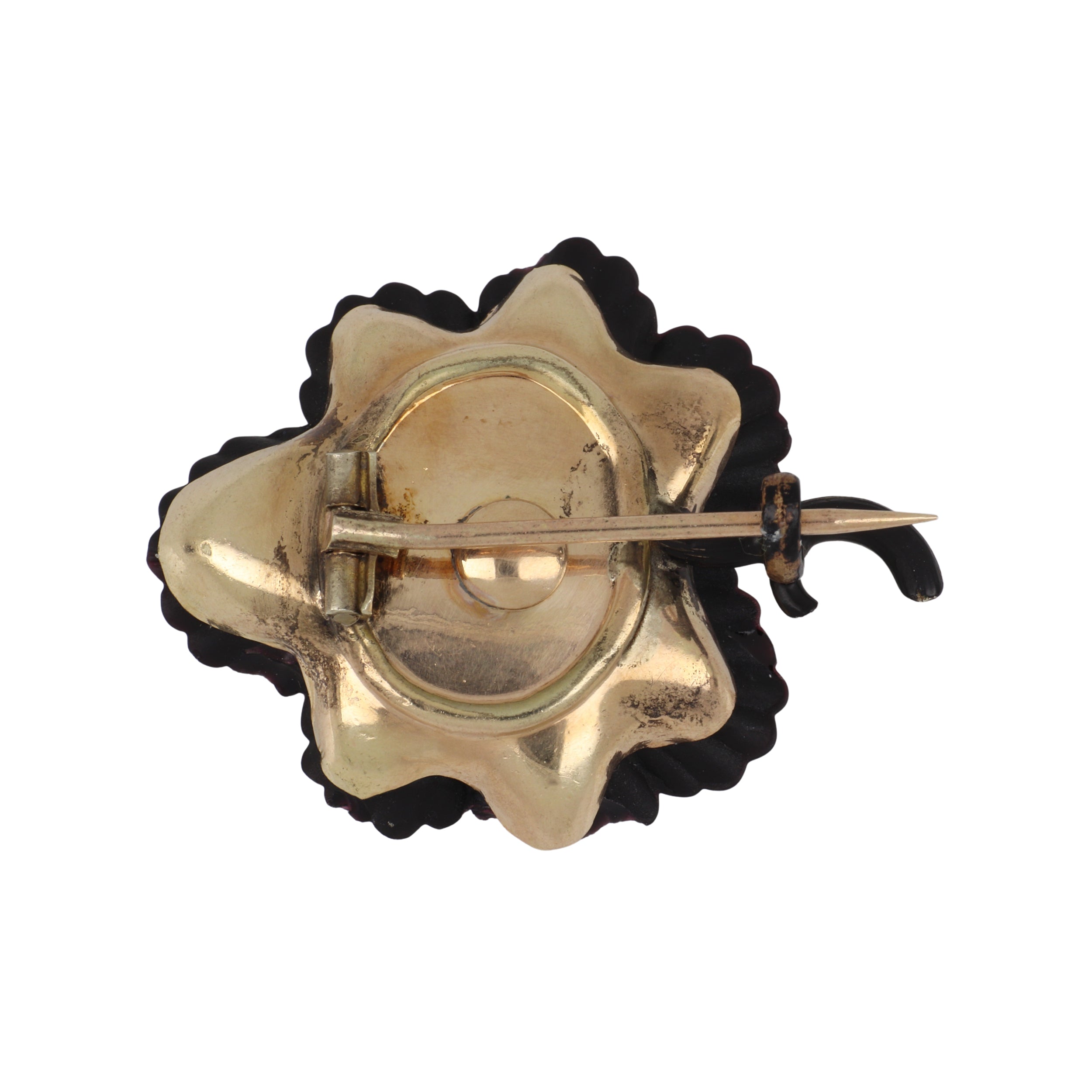 An estate antique, Victorian carved jet flower brooch set in 14k rose gold. Circa 1860.