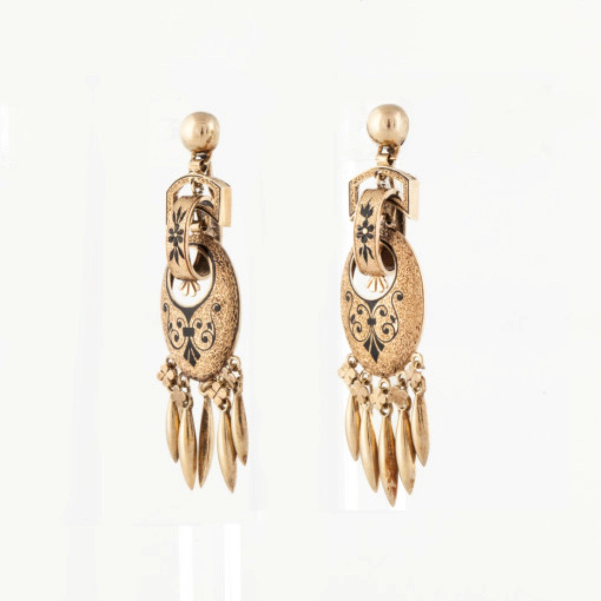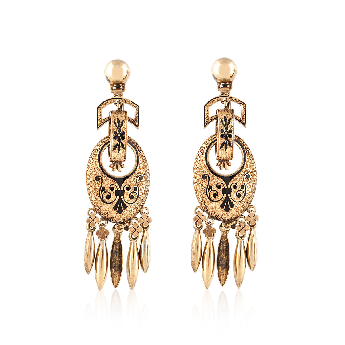 A pair of antique Victorian multi-drop black enamel tracery earrings set in 14K yellow gold. Antique Collection