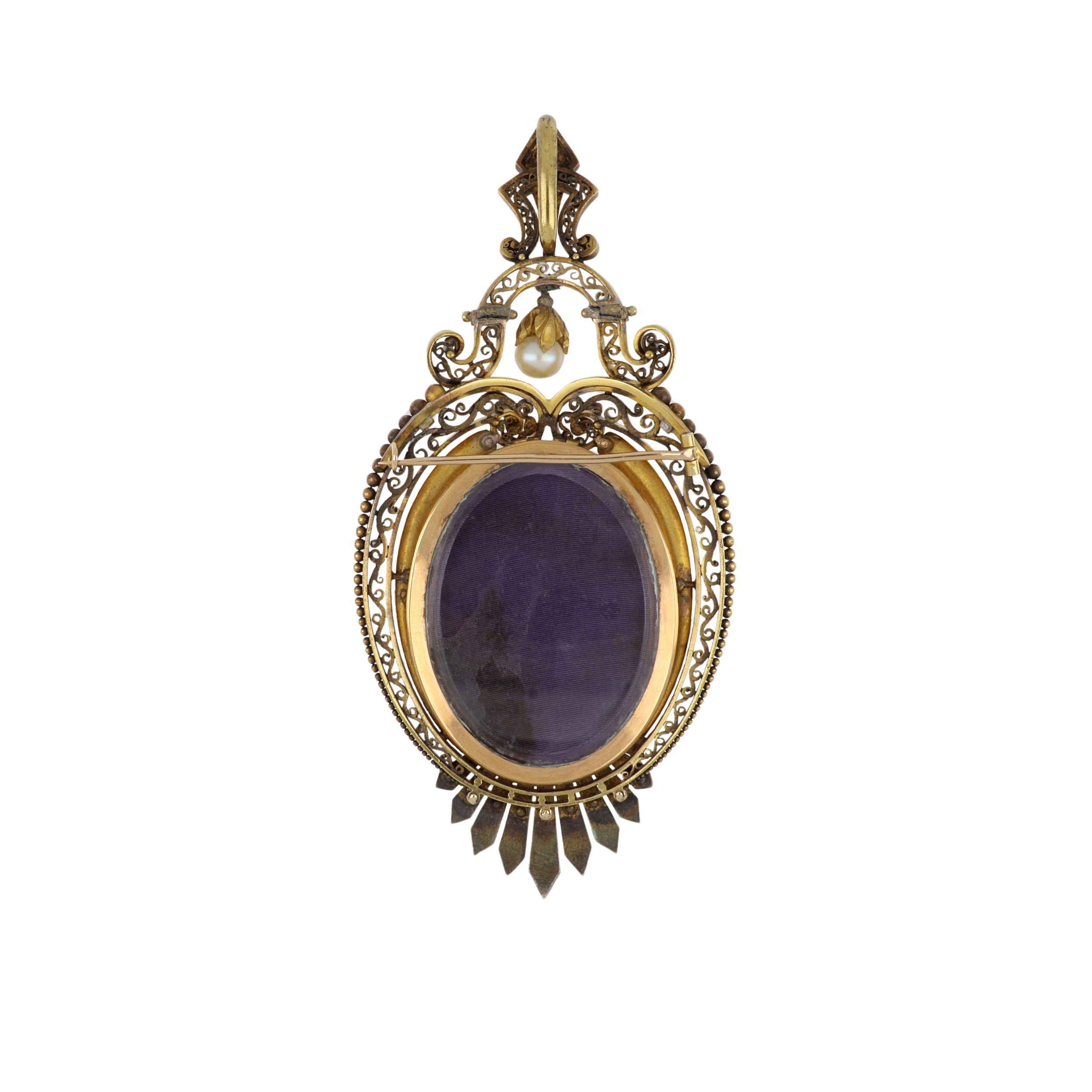 A Victorian oval, single stone, hand-painted enamel on copper, female bust portrait brooch with rose-cut diamonds and pearl border, set in 18K yellow gold. Circa 1870.