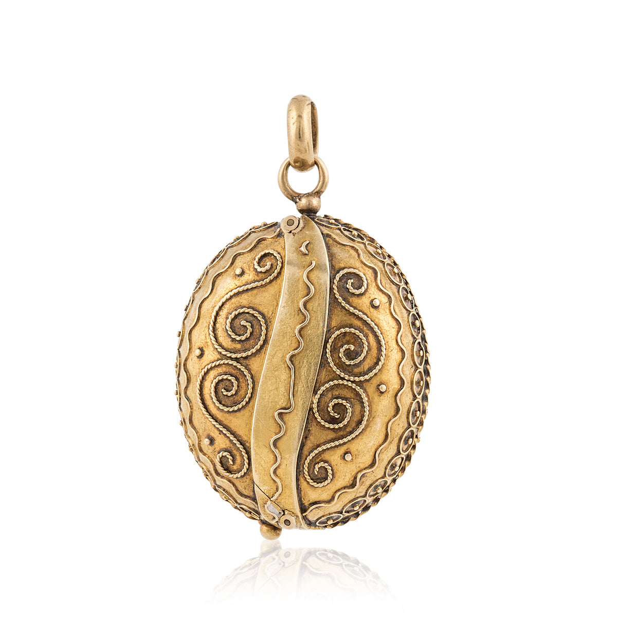 A Victorian Etruscan Revival five slot locket in 18K yellow gold. Circa 1870.