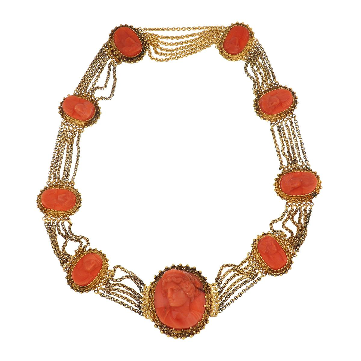 An important Victorian Etruscan Revival full face cameo collar necklace with six rows of chain connecting each cannteille frame set in 18K yellow gold. The necklace is important due to condition and preservation. Circa 1870.