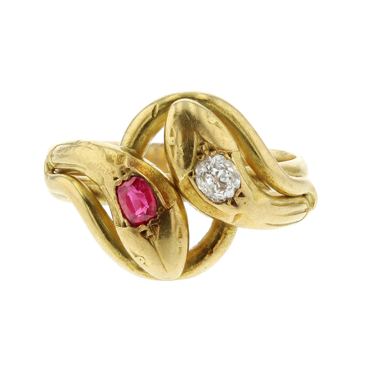 A Mid-Victorian entwined serpent ring, set with a single cushion-cut synthetic ruby and diamond in 18k yellow gold. Circa 1860.