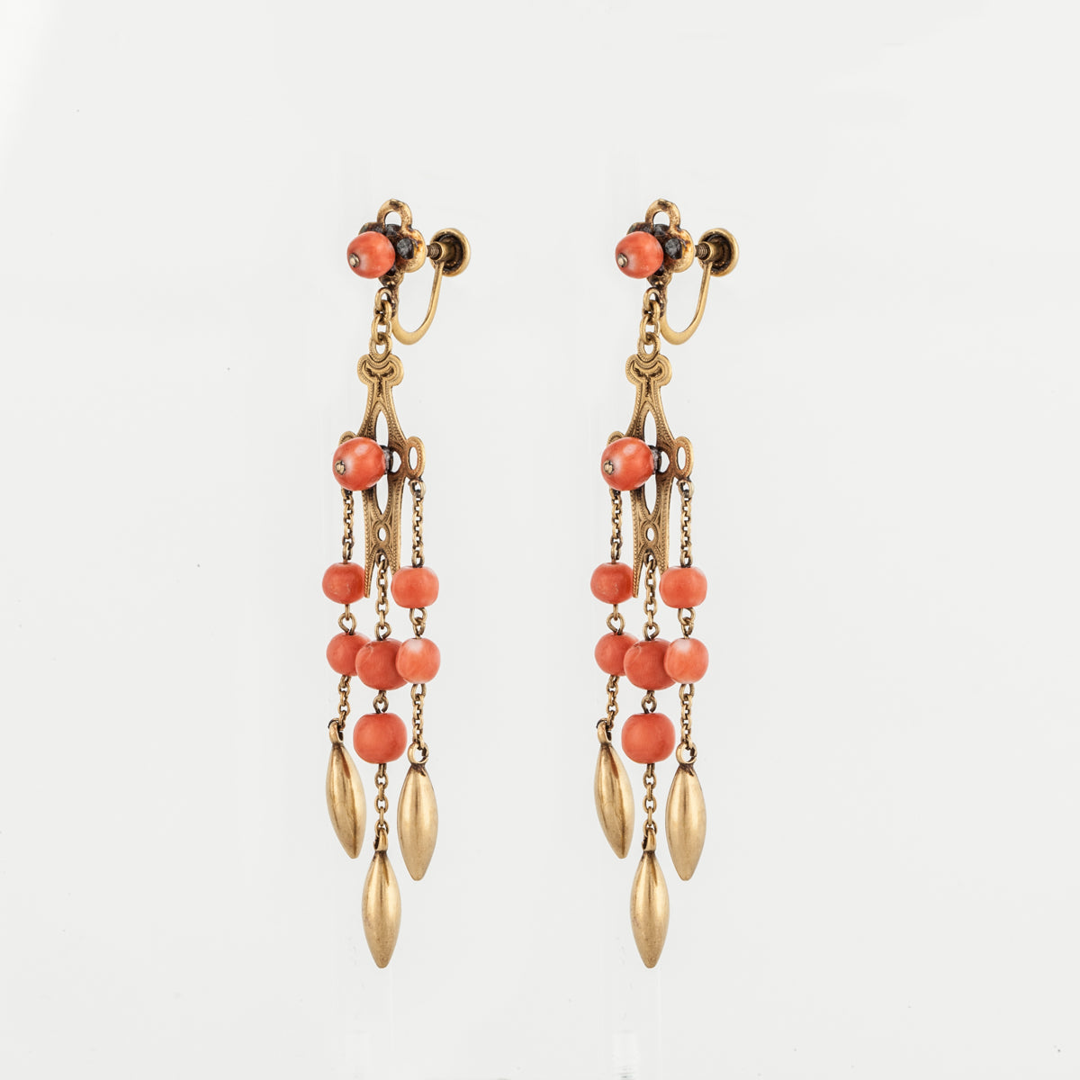 A pair of Victorian 14K yellow gold triple drop earrings with coral beads and small torpedo drops. Circa 1870. Screwbacks were added at a later date, probably in the 1920s or 30s.