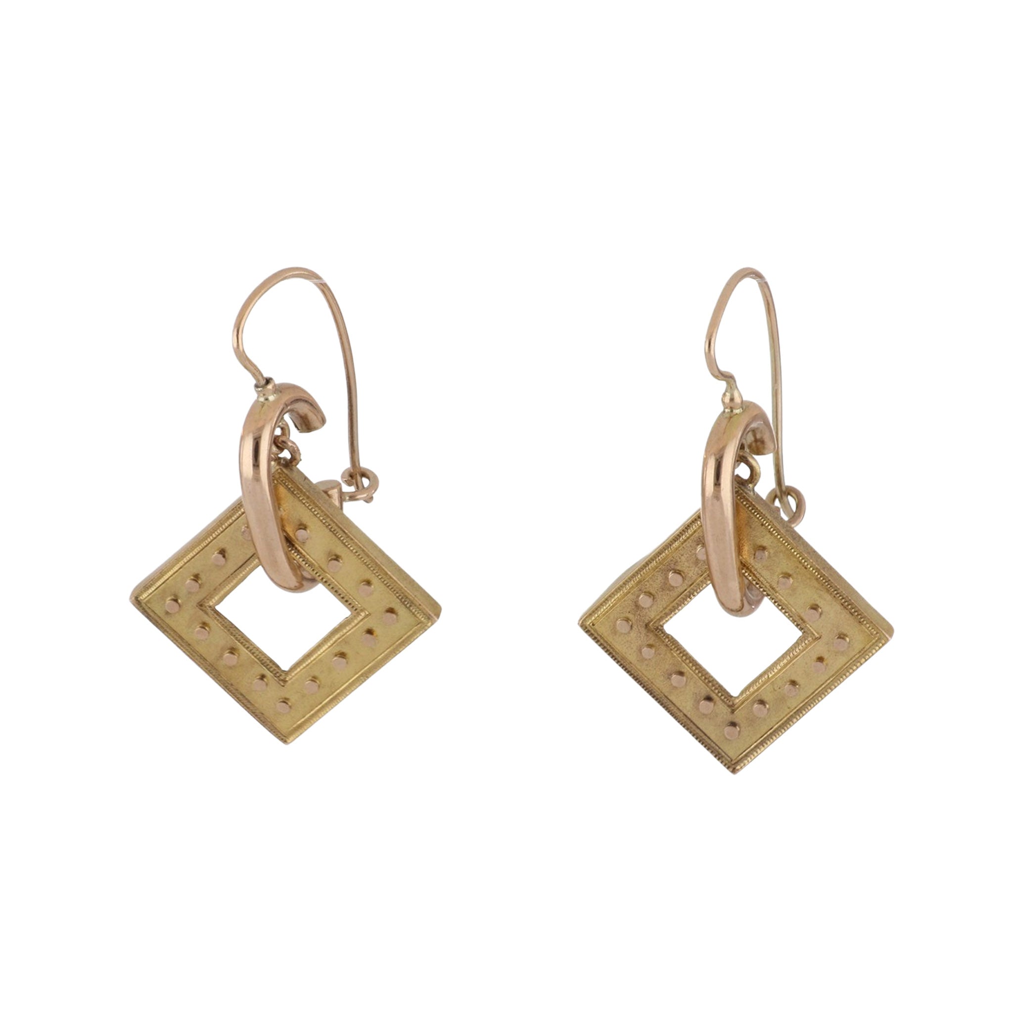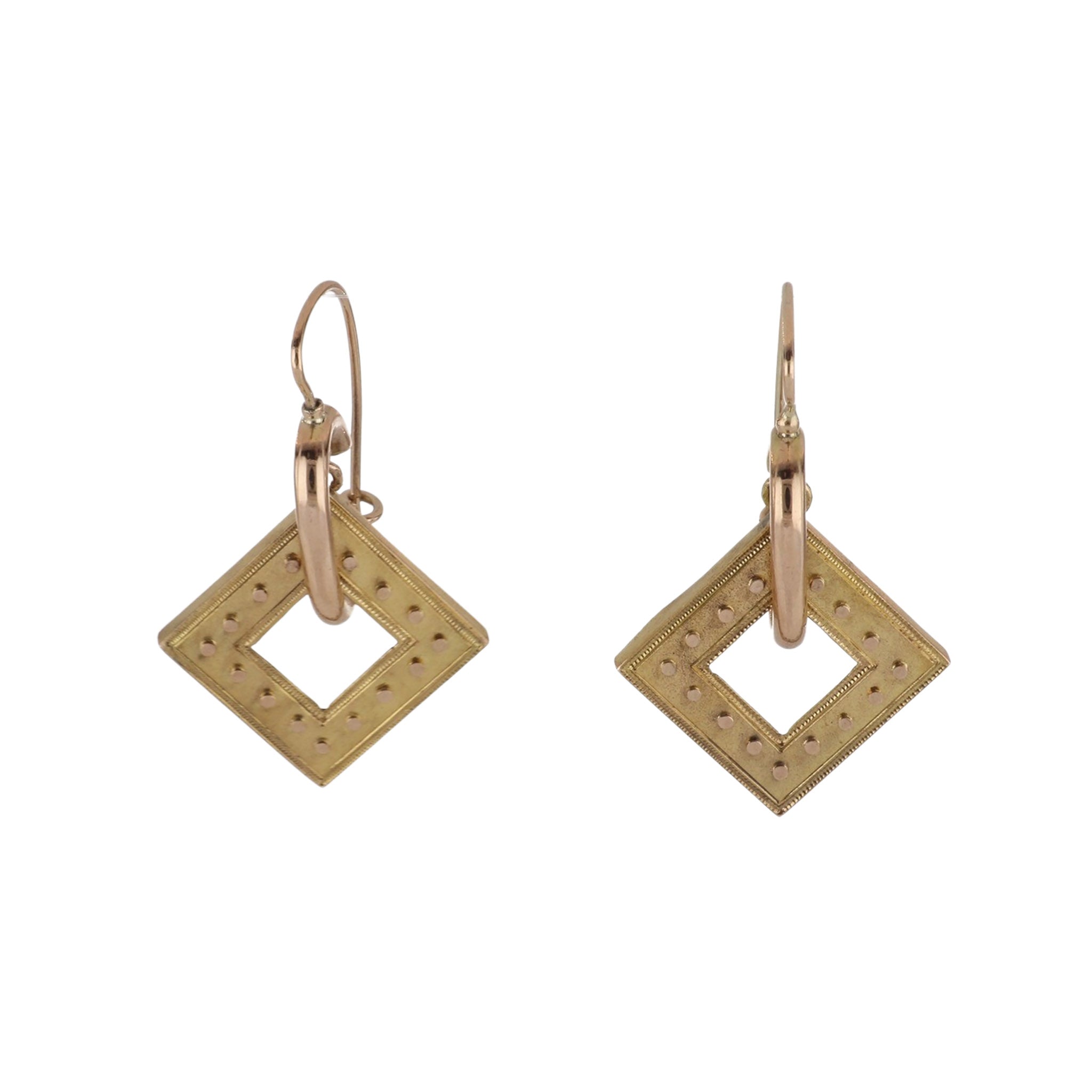 A pair of Victorian 18K yellow and 14K rose gold open squared drop earrings with Etruscan Revival elements on kidney wires. Circa 1870.Antique CollectionLength: 1.25 inches; not alterable