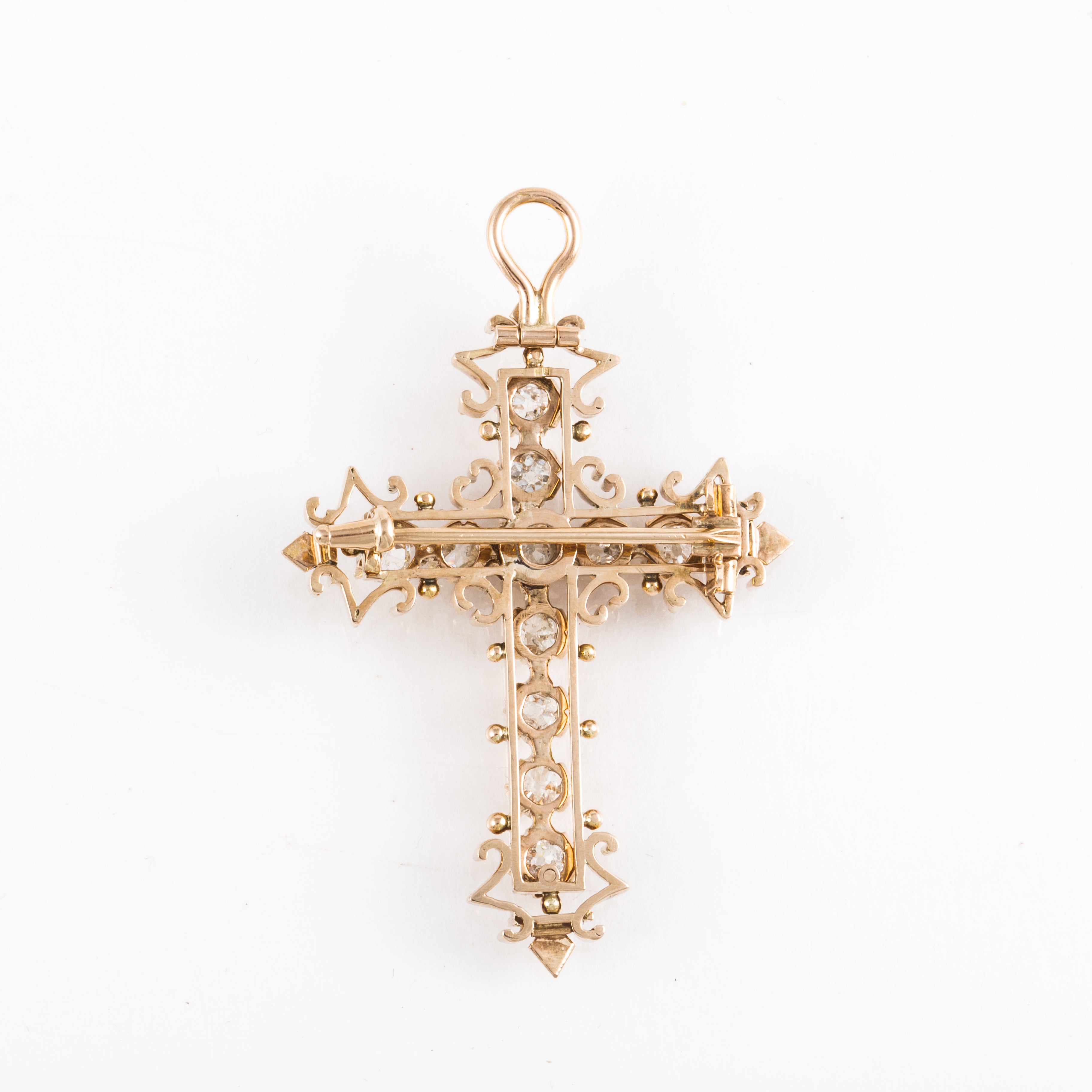 A Victorian pierced cross pin/pendant adorned with prong-set Old Mine-cut diamonds, in 14k yellow gold. Loop swivels down when worn as a pin. Pin stem has an end cap so as not to poke wearer when being worn as a pendant. Circa 1860.
