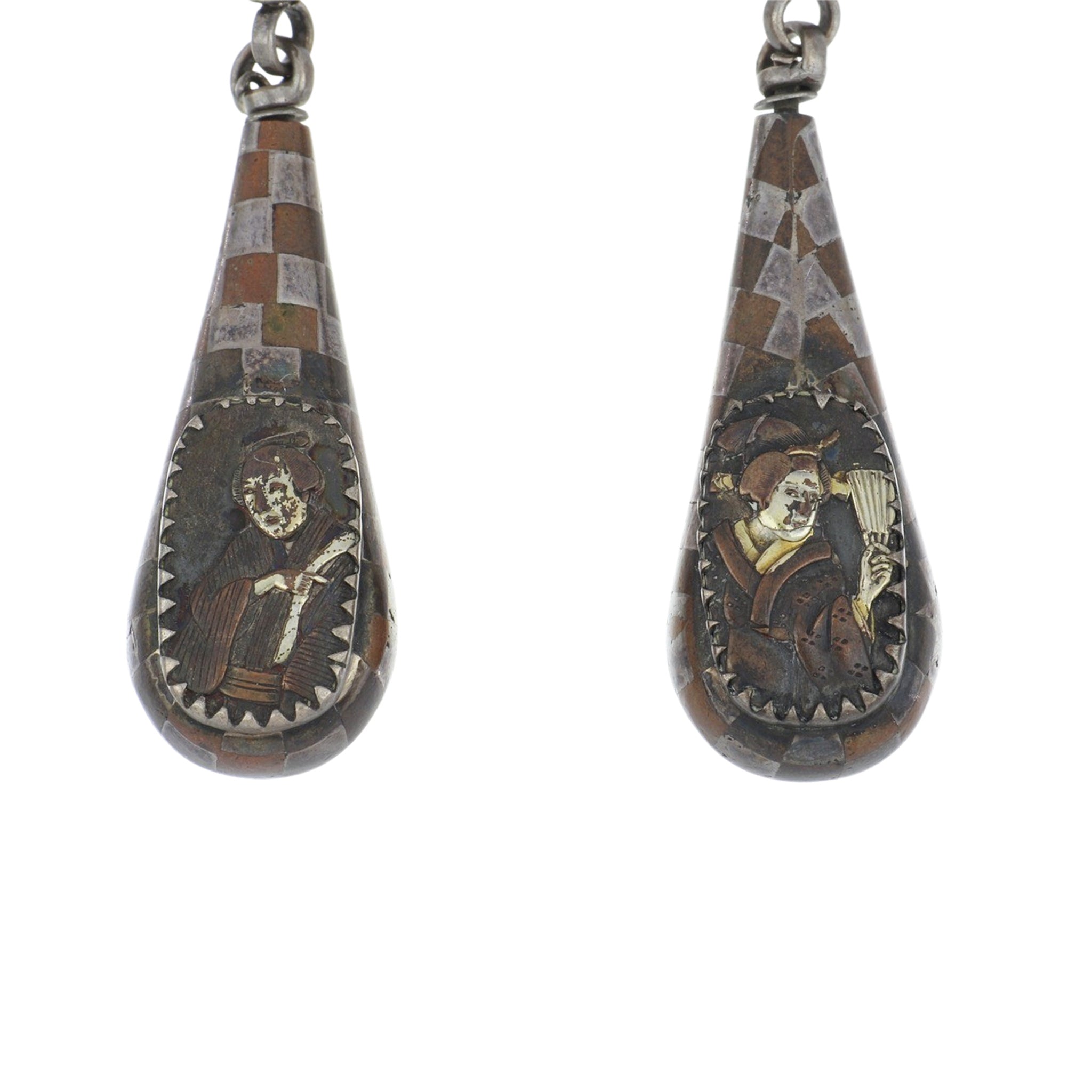 A pair of antique mid Victorian japanese Shakudo mixed metal torpedo drop earrings with harlequin design. Circa 1870.